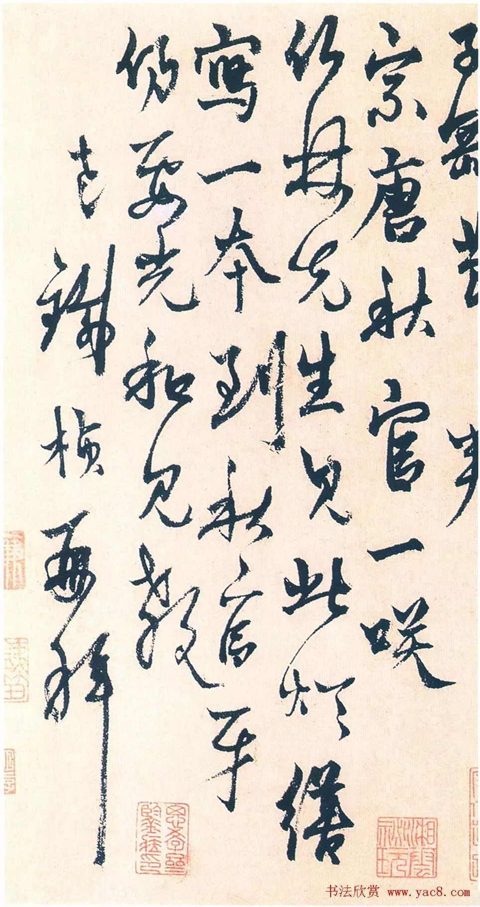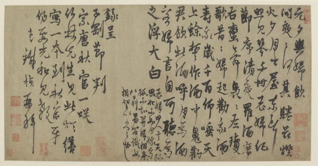 赏析:全篇真、行、草相杂,行草中多带入章草笔法和结体。下笔力透纸背,老辣之甚。字形大小悬殊,章法跌宕起伏,似乱石铺街,全篇有一种跳荡、激越的节奏,气势豪放雄宕,狂怪清劲。《元夕与妇饮》是一首乐府诗,收录在《杨铁崖先生古乐府集》中,清人顧嗣立在《元诗选》中也曾辑录。诗中主要是描写他在元宵节的夜晚与夫人一起饮酒时的快乐心情。