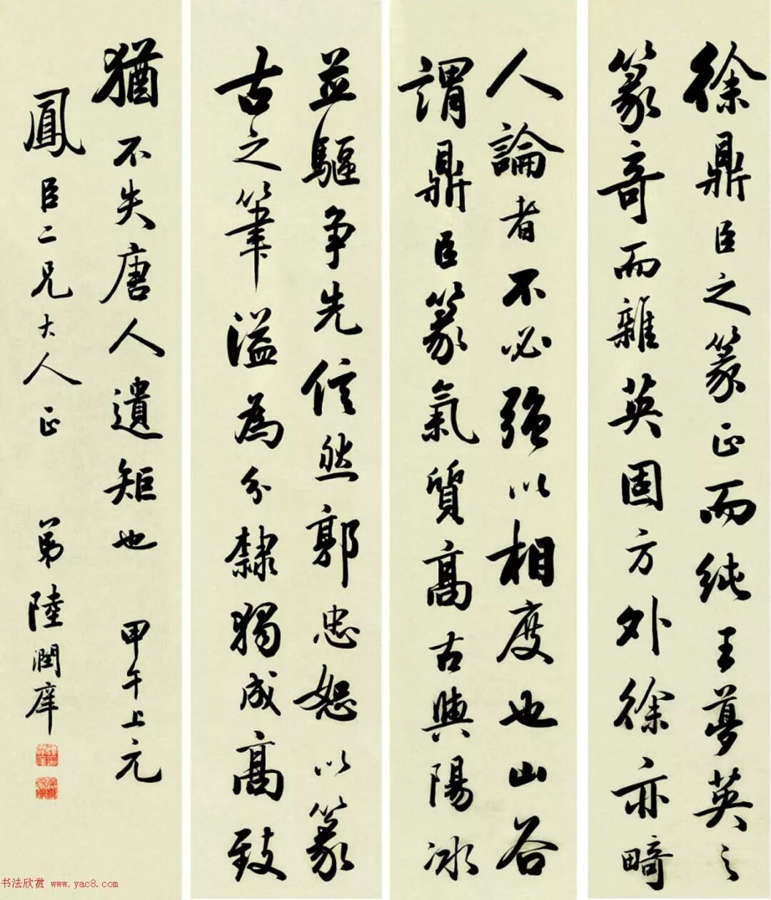 释文:徐鼎臣之篆正而纯,王梦英之篆奇而杂。英固方外,徐亦畸人,论者不必强以相度也。山谷谓鼎臣篆“气质高古,与阳冰并驱争先”,信然。郭忠恕以篆古之笔,溢为分隶,独成高致,犹不失唐人遗矩也。甲午上元。凤臣二兄大人正。弟陆润庠。