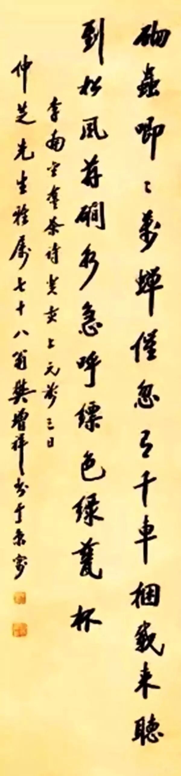 释文:砌虫唧唧万蝉催,忽有千车捆载来。听到松风并涧水,急呼缥色绿瓷杯。李南金煮茶诗。癸亥上元前三日。仲芝先生雅属,七十八翁樊增祥书于京寓。