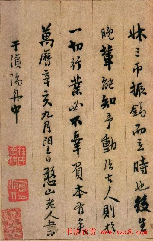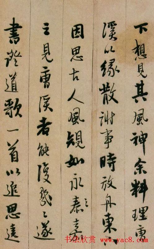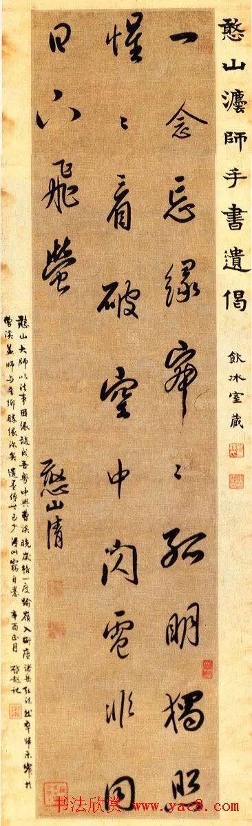 从其取法的角度看,憨山悟性极高,有聪慧之气,所以他的作品前人的影子不多,自己的个性不少,有时还善于在个别点画中以隶意出之,这在妍美的风格上掺和进了一点古拙的意味。
