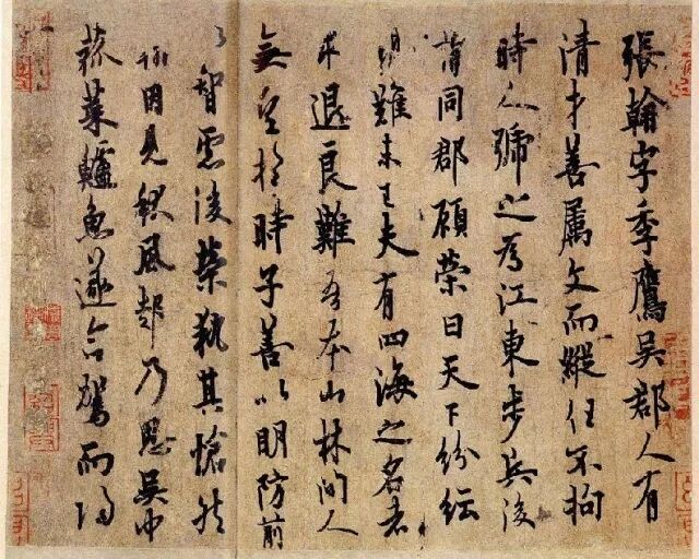 张翰出身吴地望族,他的父亲张俨做过吴国的大鸿胪。吴国灭亡,江南许多旧朝的士绅期望跟新的西晋政权合作,纷纷北上求官,其中包含了陆机、陆云、顾荣、贺循、张翰。他们的时代比王羲之稍早,他们的故事却一一都成为后来南朝王羲之那一代文人的深刻心事。他们的故事留在《世说新语》中,与南朝文人跌宕自负的“手帖”,一同成为江南美丽又感伤的风景。