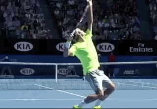 我们换一个角度看罗杰是如何将这一高弹跳、追身球化解的,脚下生根,身体极度后仰,像满月的弯弓,只不过不是蓄势发力,而是击球后维持身体平衡的代偿动作。