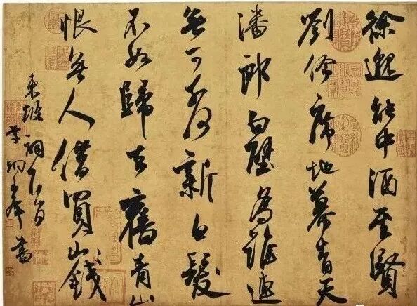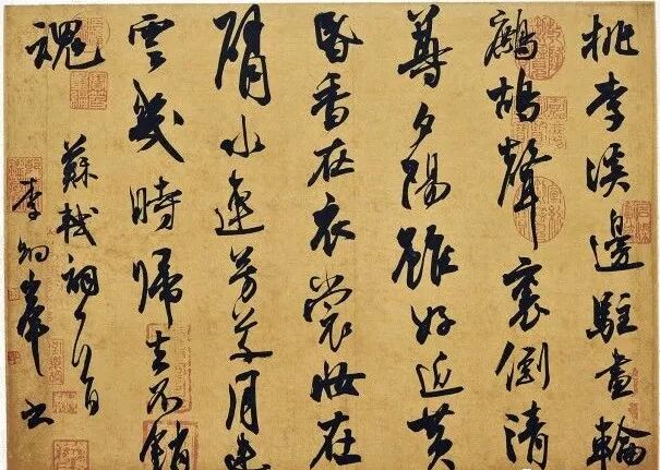 3、借鉴原帖的章法,这里我只能说借鉴,因为线条连与断的对比,粗与细的对比;大字与小字的对比;字组疏与密的对比都可以再现,但墨色的枯湿浓淡变化是很难苛求的,毕竟工具上有差别,古人一笔墨能写很多字,你的笔未必做得到,因此章法我们更多的应该是借鉴和思考,去总结一些规律,关于我自己总结的一些规律大家可以去看看拙文《试谈硬笔行草书创作》,硬笔毛笔基本同理,关于墨色变化,我觉得刘洪彪先生的话很有道理,一句话,一句诗,不管句子长短,你用一笔墨写完,下一句再另行醮墨,墨色过渡也就自然,还起到了断句的作用。
