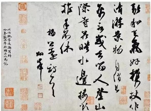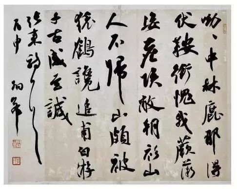 3、协调的布局,实际上就是营造各种矛盾元素的对比,终而形成和谐统一的整体效果,包括的矛盾元素大凡有:线条连与断的对比,粗与细的对比;墨色浓与淡的对比、枯与湿的对比;大字与小字的对比;字势的欹与正的对比,字组疏与密的对比。