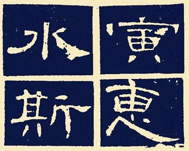 试看《曹全碑》中的几个字:“水”字竖画两旁的点画呈相背之形,但以竖画中上部为中心,两边则又有辐较之状,“寅”字“宝盖”的三竖点与下部的两斜点,左右上下彼此呼应,共同聚向一个中心,“斯”字“其”、“斤”相向而神会,“惠”字“亩”、“心”相承而力合,其间架结构总是外散其形而内聚其力。