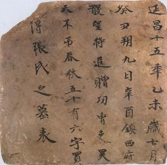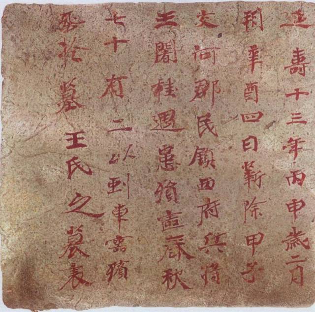 此墓表为砖质。高32.5CM,宽33CM。朱书,6行54字。1930年新疆吐鲁番雅尔湖出土。北京故宫博物馆藏。