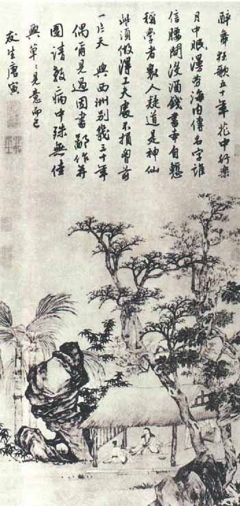 三曰“傲气”。这位“吴门才子”确曾说过这样的话,自谓“江南第一风流才子”。笔者揣测,这当是一句惯世嫉俗的发泄话!唐寅一生坎坷,命运多舛,29岁中举,第二年便下了大狱,平冤后,罢官为小吏,自此遂绝仕途,寄情诗文字画;晚年自视人生“如梦幻泡影,如露亦如电”;红尘看破,皈依佛法(取号“六如居士”),但他人性仍未泯灭,每每以诗明其夙志,以酒壮其胆识,以画添其英气;家境呈贫,常卖画充资,但不俯首,不示弱,是一个十分孤高自傲的艺术家,“傲”得几近狂放。
