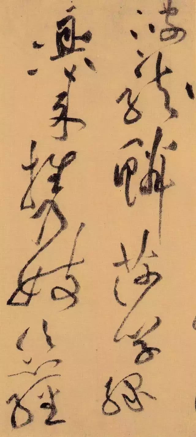 黄庭坚的单字衔接颇有特色。相邻两字常常互相穿插,一字的凸出部分往往嵌入另一字的凹处,尽管有摆布的痕迹,但总能形成特殊的视觉效果;两字之间,书写时紧紧相连的端点被各种紧贴的结构隔开,空间成为构成作品的主导因素,时间退至第二位——唐人狂草则完全是另一种感觉。