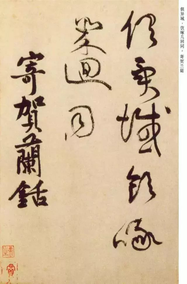 该帖笔法圆劲,笔势连绵,如龙蛇飞舞,达到心手两忘的境界。尾“寄贺兰铦”四字写作行楷书,矫拔精健,与前草书诗文的飞动气势相映生辉。虽短短八行,却是黄庭坚的草书佳作。