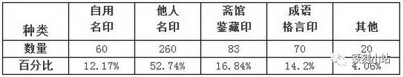 前文采用的是让翁为自己刻制的名印进行分析,然而通过对二玄社出版的《篆刻全集邓石如·吴让之》中收录的吴让之印章内容进行统计,绘制了如下的表格。该书为目前市面常见的收录吴让之作品较全的书籍,统计数据虽然仍不够全面,但也具有一定的参考价值。可以发现,为他人刻制的姓名印占了大部分,达到了52.74%。吴让之自题《印略》:“六十年刻以万计,从未留一谱,自知不足存耳!