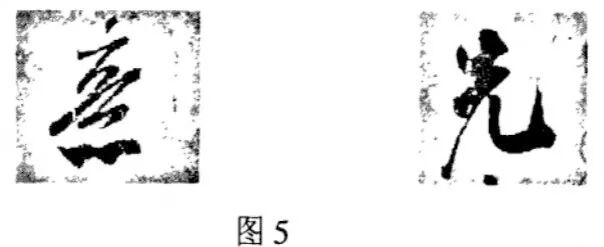 纵观米芾尺牍,下笔如飞,痛快淋漓,毫无顾忌,点画之际,妙趣横生。粗看,“全不缚律”,左倾右倒,形骸放浪。仔细赏读,却又欹正相生,字字随著章法气势变化,用笔狂放而不失检点,提按顿挫丝丝入扣,上下精神,相与流通,有著强烈的节奏感,颇得魏晋风韵,笔法圆转含蓄韵藉,有篆籀气。每一行字中,总有几个字笔划粗一点,几个字笔划细一点。即使每一个字中,笔划也往往有些粗细不同的变化。粗者用笔较重,细者用笔较轻。由于粗细相间,字才显出重轻、虚实和跳动的节奏来。(图5)
