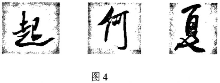 昔人以为欲明书势,须识中宫。这点米芾恐怕从欧阳询那里学到不少。九宫尤莫重于中宫。凡字之疏密斜正,必有精神挽结之处,兹即谓“中宫”。黄山谷书师法大字《瘗鹤铭》,收其中宫,宽其外侧,形成“辐射状”。中宫紧是黄山谷字的特点。米字虽不若黄字明显,,但从结体中仍能约略窥见此老留意处。米芾曾说:“见柳(公权)而慕紧结,乃学柳(《金刚经》)。久之,知出于欧(阳询),乃学欧。”欧、柳的紧结对于米有过不小的影响,米字跌宕纵逸,而无松弛、涣散之弊,正是此故。(图3)