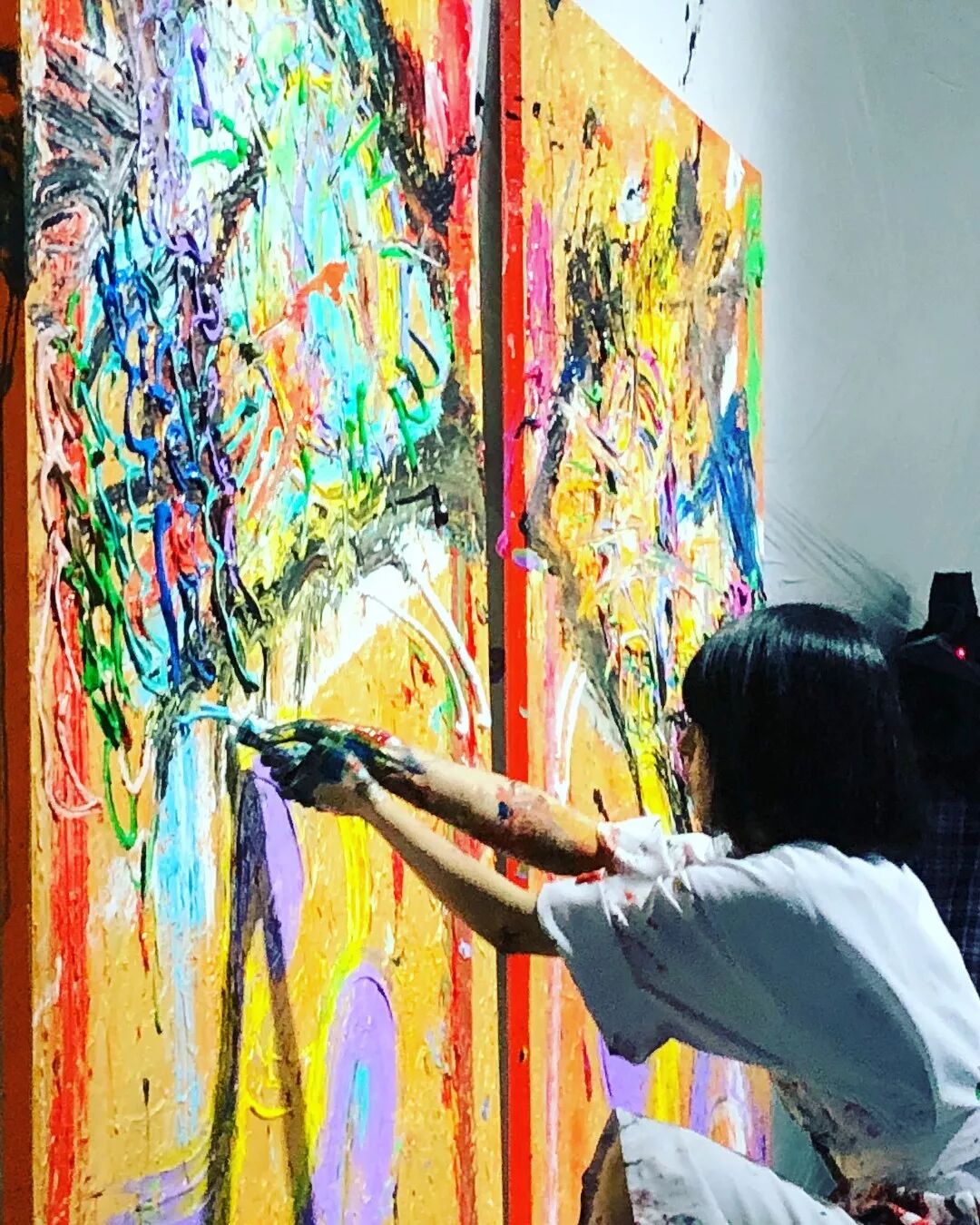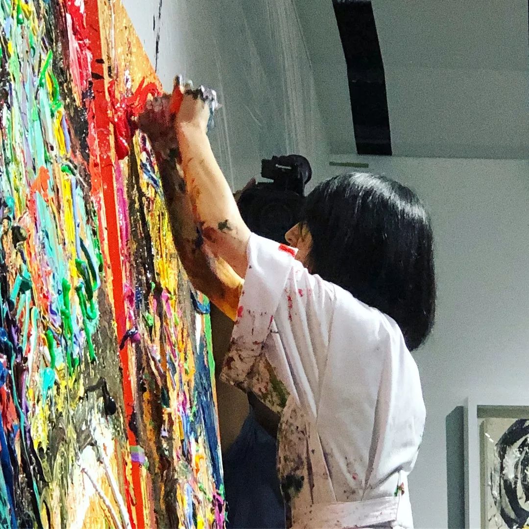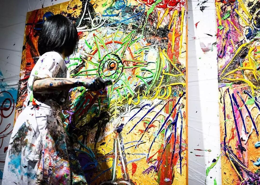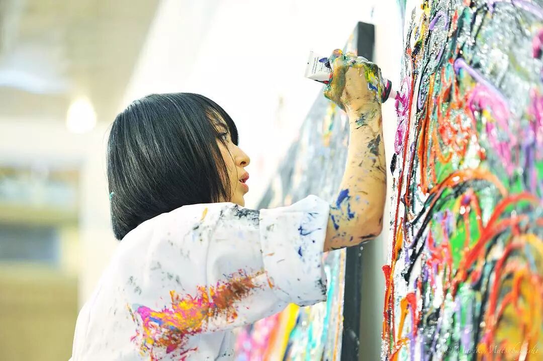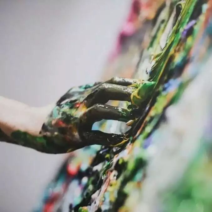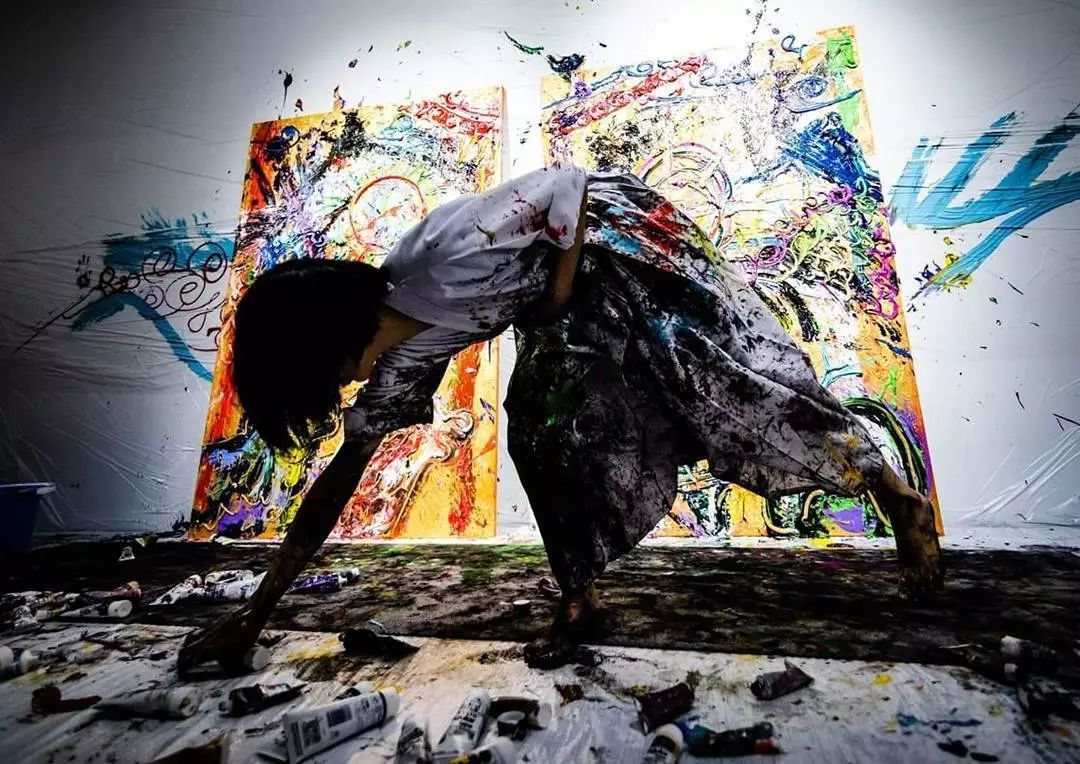 她就拿颜料瓶直接扔、甩、涂、抹、泼