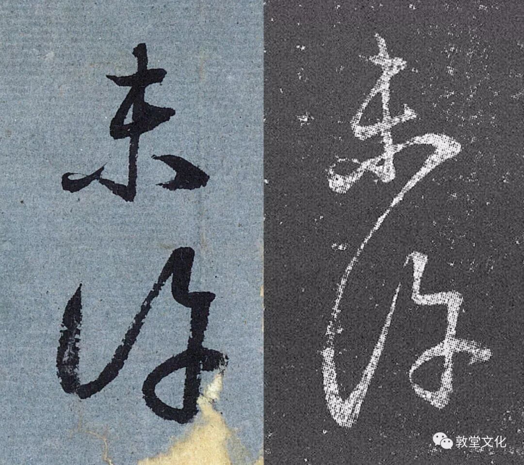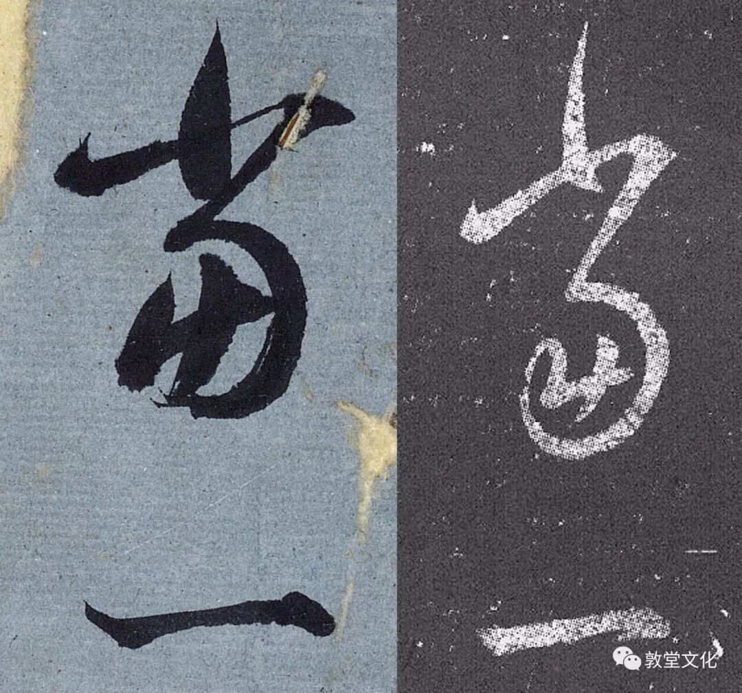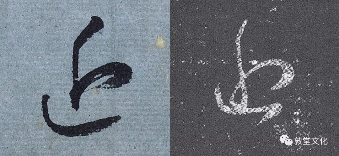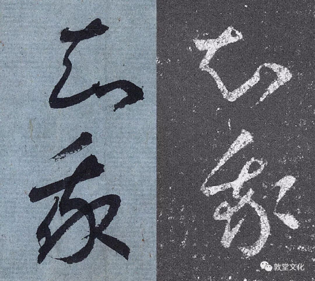 对比看下来,发现除了在用笔的连接映带和字形构造的体势等方面有些差异,其它方面都非常接近,感觉是对着原本所临。沈乐平先生在《敦煌写本概说》一文中,讲到此帖时写到:检其笔法特征,确能契合唐摹本的王羲之《远宦》《游目》诸帖,说明书者对“王字”的理解是相当到位的。敦煌这一批“王字”临本,书者皆精于草法,书写速度较快,故笔势畅达、爽利果敢,与“王字”风韵精神极为合契。用笔方面,起承转合、来龙去脉交代得非常清晰,挥运间使转自如、锋芒毕现,状态放松,故行气畅达。但其格式和结字与宋刻有所不同,自由挥洒的味道更浓——而这比刻意模仿或许更能反映出主体的技法水准和取舍观念。