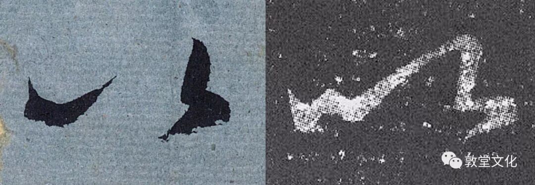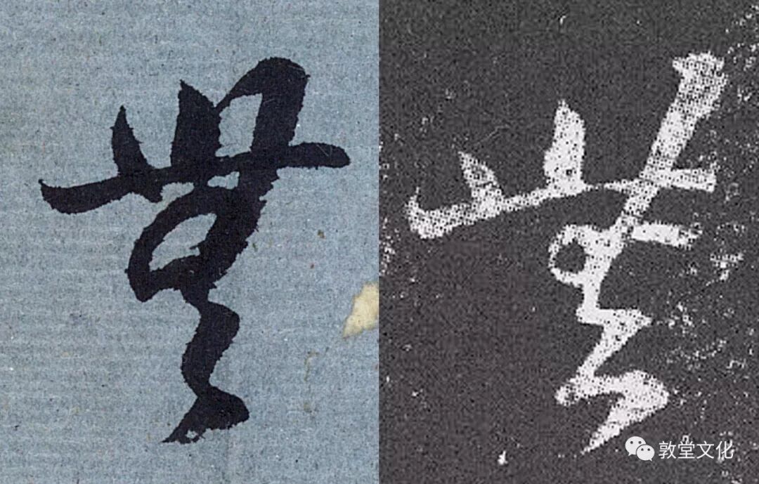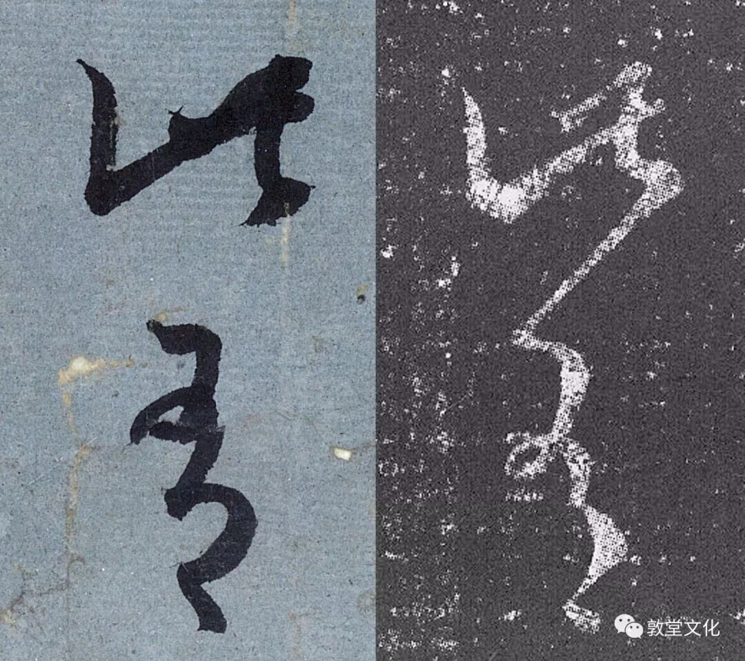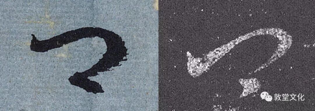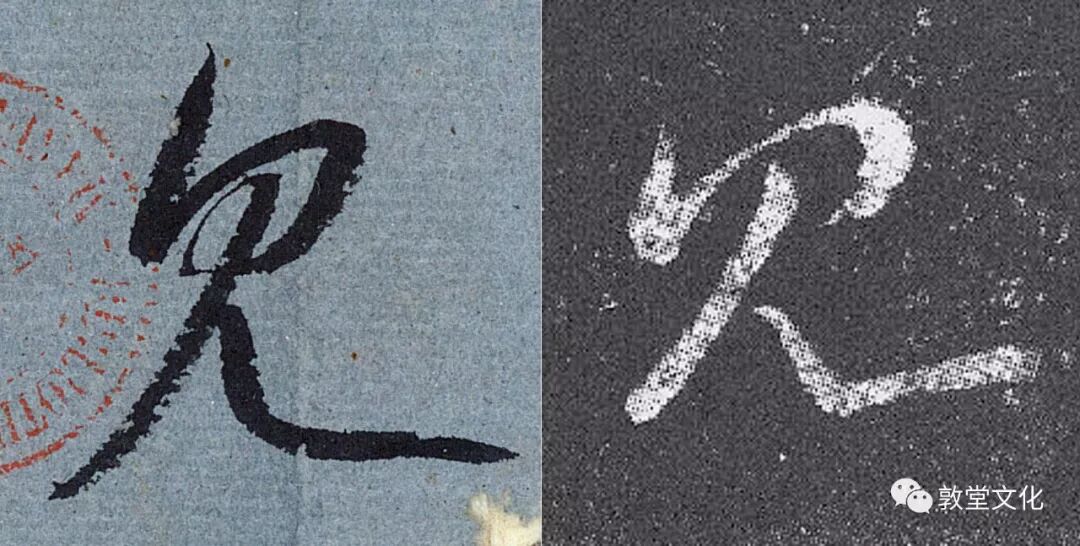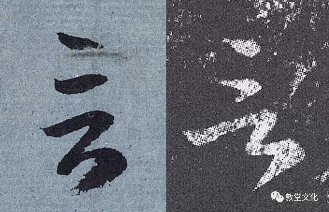 对比看下来,发现除了在用笔的连接映带和字形构造的体势等方面有些差异,其它方面都非常接近,感觉是对着原本所临。沈乐平先生在《敦煌写本概说》一文中,讲到此帖时写到:检其笔法特征,确能契合唐摹本的王羲之《远宦》《游目》诸帖,说明书者对“王字”的理解是相当到位的。敦煌这一批“王字”临本,书者皆精于草法,书写速度较快,故笔势畅达、爽利果敢,与“王字”风韵精神极为合契。用笔方面,起承转合、来龙去脉交代得非常清晰,挥运间使转自如、锋芒毕现,状态放松,故行气畅达。但其格式和结字与宋刻有所不同,自由挥洒的味道更浓——而这比刻意模仿或许更能反映出主体的技法水准和取舍观念。
