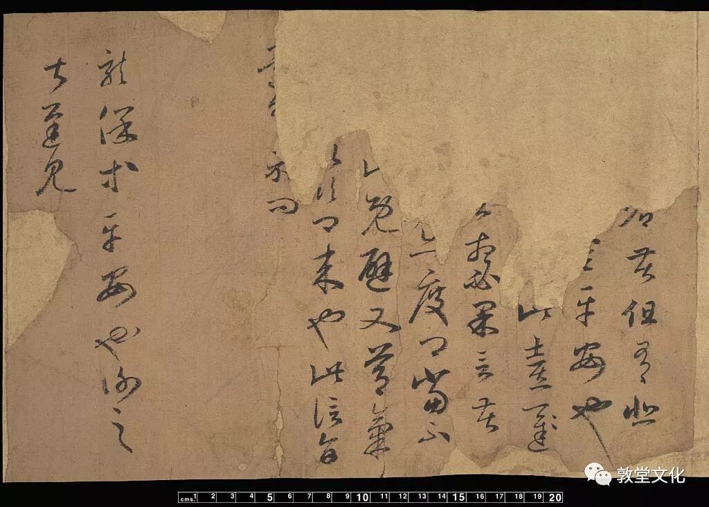 经对比,敦煌藏经洞这张写在灰红色纸张上的草书墨迹内容确定为是唐人临写的王羲之《瞻近》《龙保》二帖。此临本笔法锋芒毕现,行笔自如流畅,行款、结字与宋拓刻本稍有不同。可惜已残损,但仍保留了原作的风神。