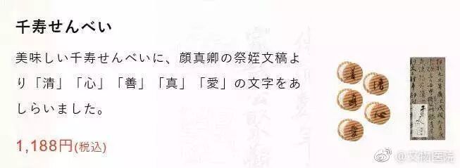 其中除了那个“爱”“心” 酱油碟外,还有一款从《祭侄文稿》中挑选的“清、心、善、真、爱”五个字做成的日系点心,每个字一块点心,凑成一盒。最绝的是,包装盒上正是完整截取了“父陷子死,巢倾卵覆”一段.........字自然都是好字,但想到这是颜鲁公对着侄儿的头骨悲愤而成的时候是否有点下不了口呢?还是准备送给自己最“恨”的人呢?