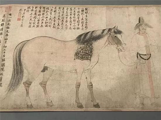 黄庭坚题跋:“余尝评伯时人物,似南朝诸谢中有边幅者,然朝中士大夫多叹息伯时久当在台阁,仅为书画所累。余告之曰:伯时丘壑中人,暂热之声名,傥来之轩冕,殊不汲汲也。此马驵骏,颇似吾友张文潜笔力,瞿昙所谓识鞭影者也。黄鲁直书。”