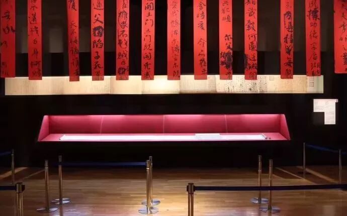 《祭侄文稿》安排在东京国立博物馆第一展厅的一处独立区域进行展示,真迹在低光玻璃展柜中进行展陈,上面则展示着颜真卿书法及历代题跋全卷的高清仿本,以及对书写状态的说明,以让观众一窥全貌,而高仿本上面,则悬挂着《祭侄文稿》手迹的一条条红纸放大版,这样的展陈规格是相当高的。也可见日本东京国立博物馆对这次展览的重视。