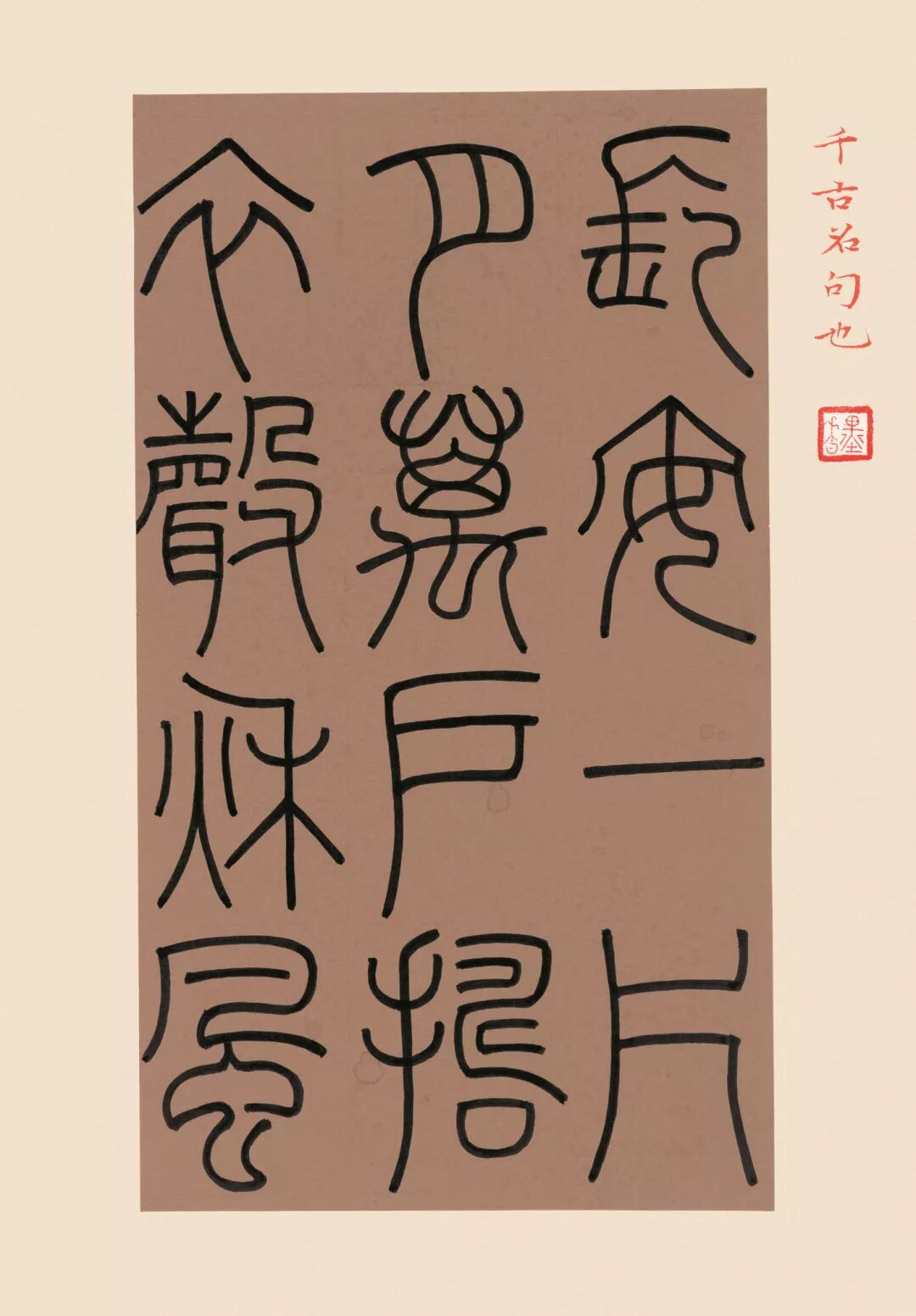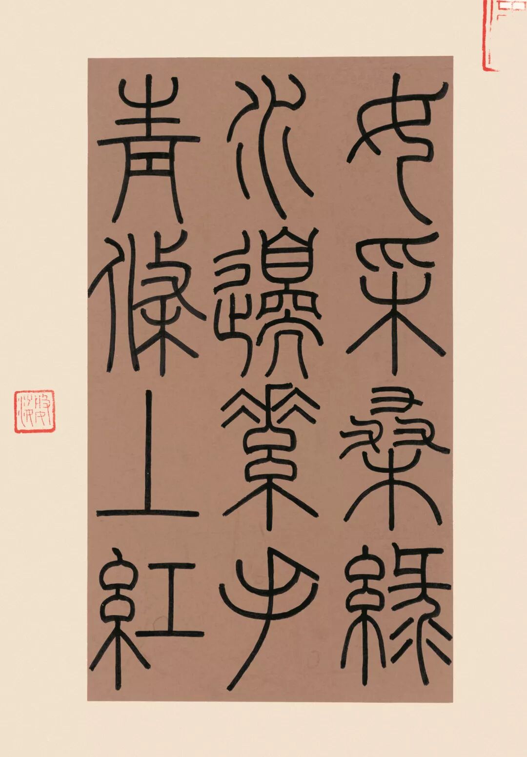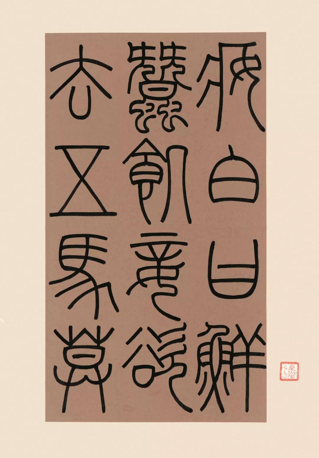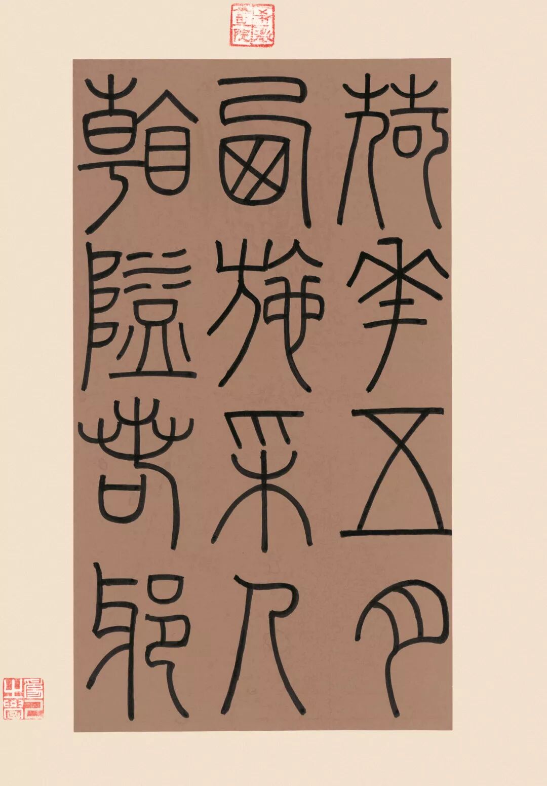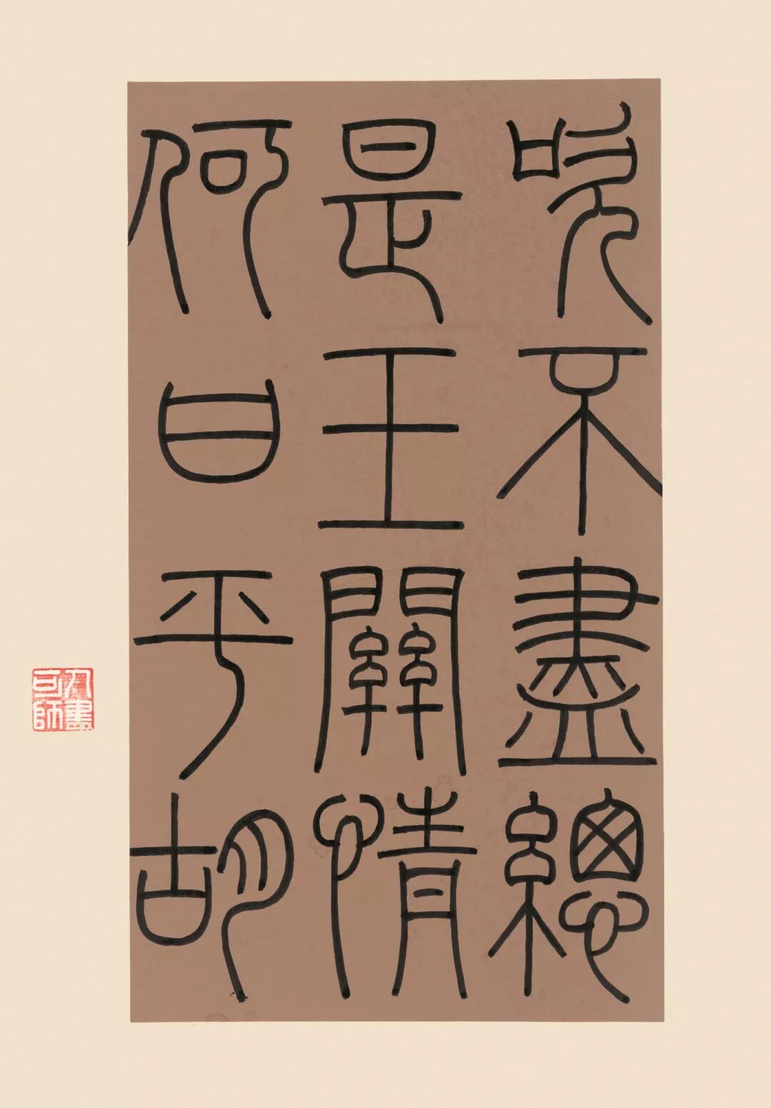 因册页本案头展玩之物,故以篆、隶创作之,必以笔法圆融、结体修美、布局精整、风格雅正为主流表现之手段,以求其雍容混穆、朴茂典雅之气息。又凡篆、隶皆取古汉字之构成,故每字书写必有丰富生命力之表现,取自然之法,百物之状,情趣盎然,正大气象。