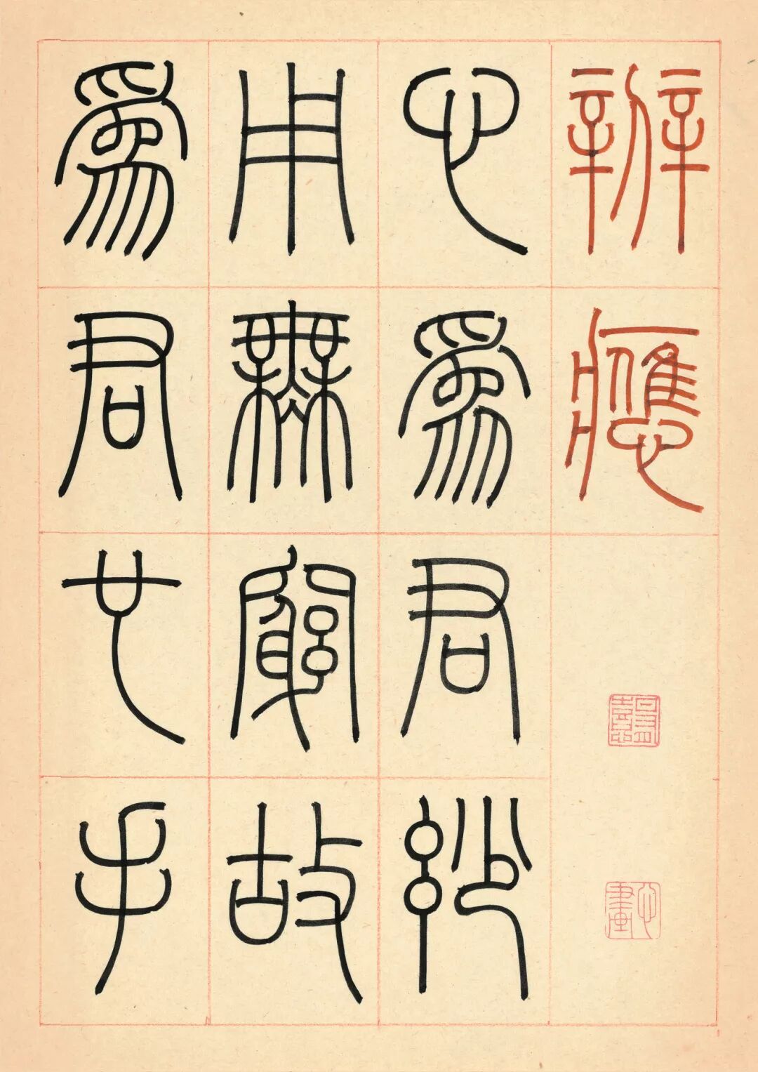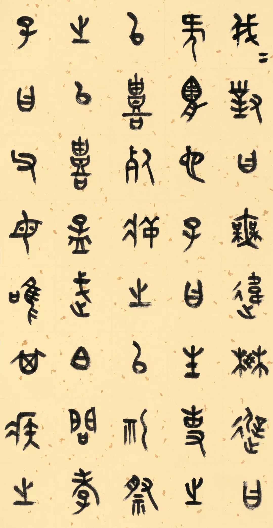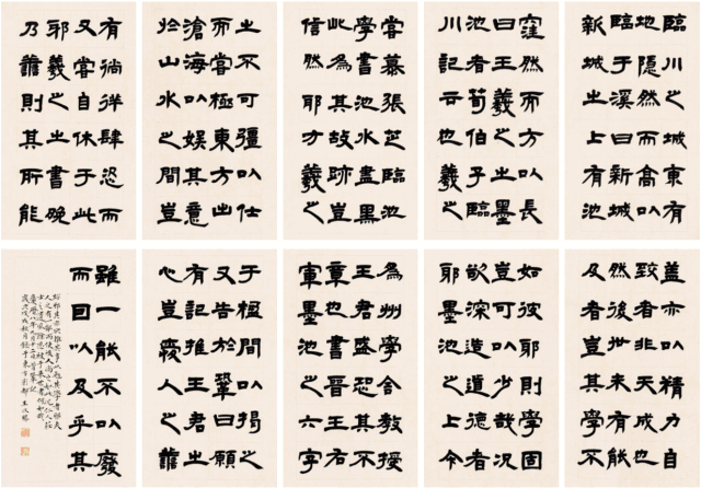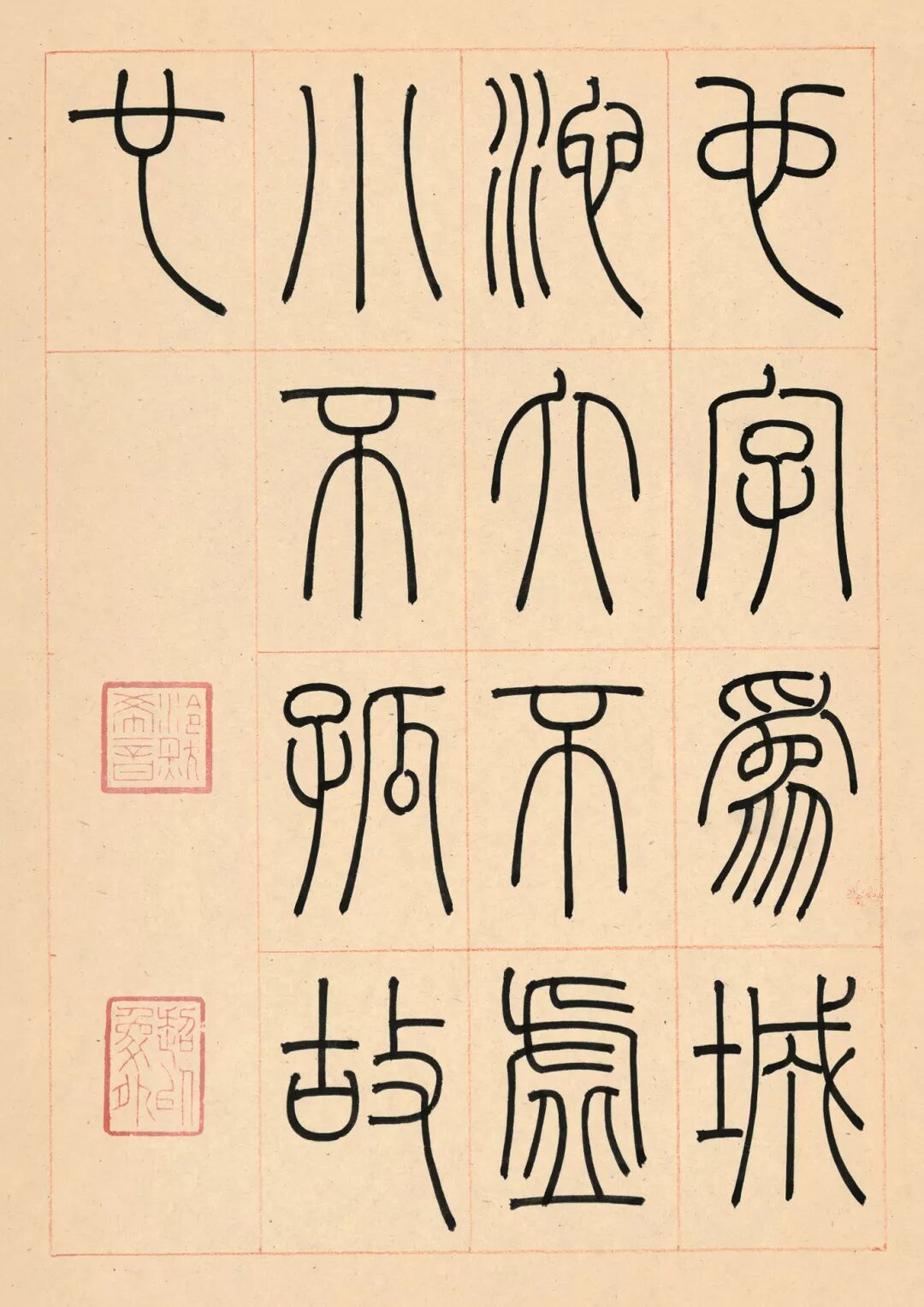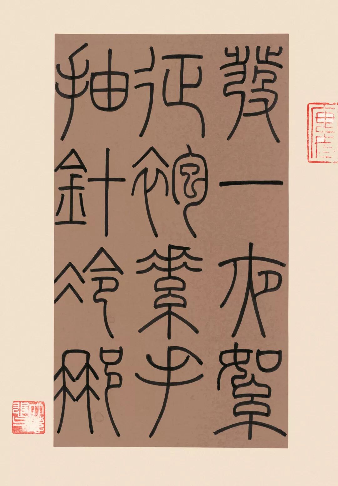 因册页本案头展玩之物,故以篆、隶创作之,必以笔法圆融、结体修美、布局精整、风格雅正为主流表现之手段,以求其雍容混穆、朴茂典雅之气息。又凡篆、隶皆取古汉字之构成,故每字书写必有丰富生命力之表现,取自然之法,百物之状,情趣盎然,正大气象。