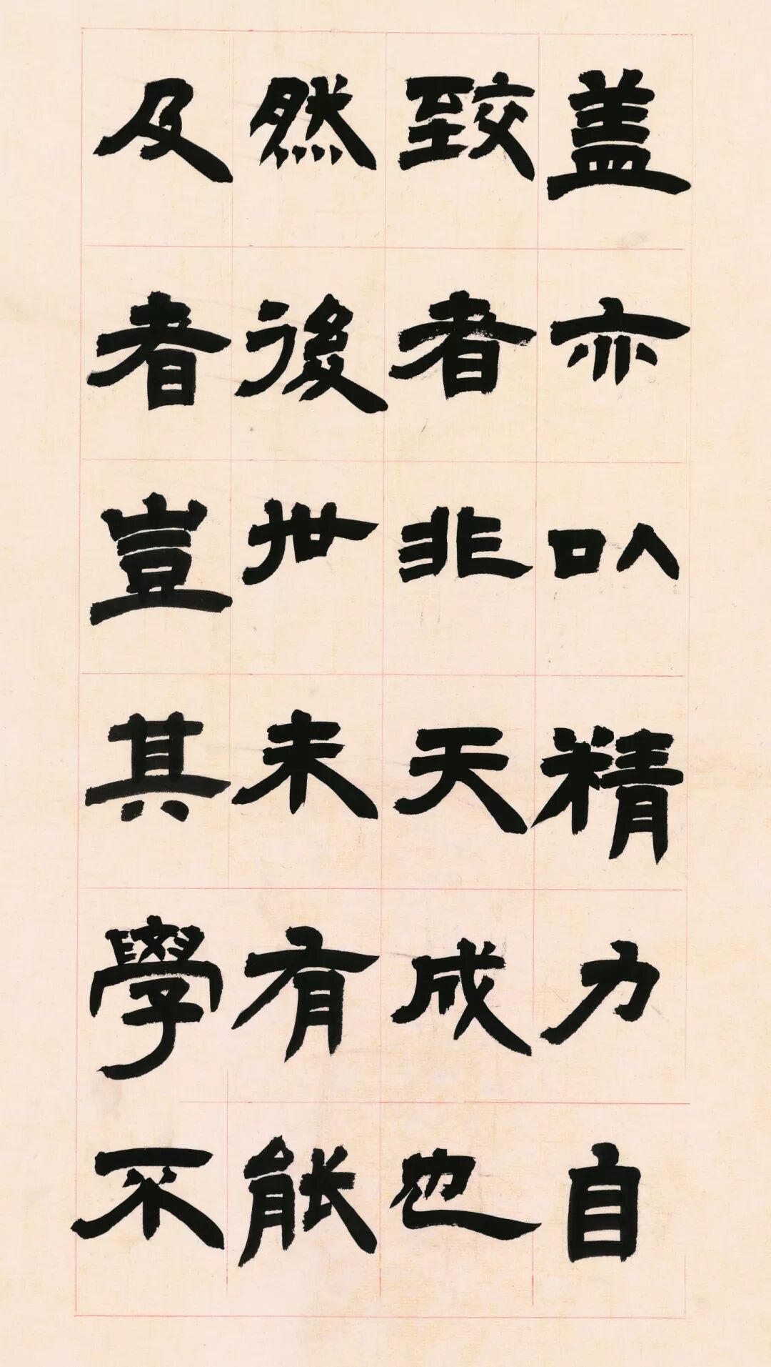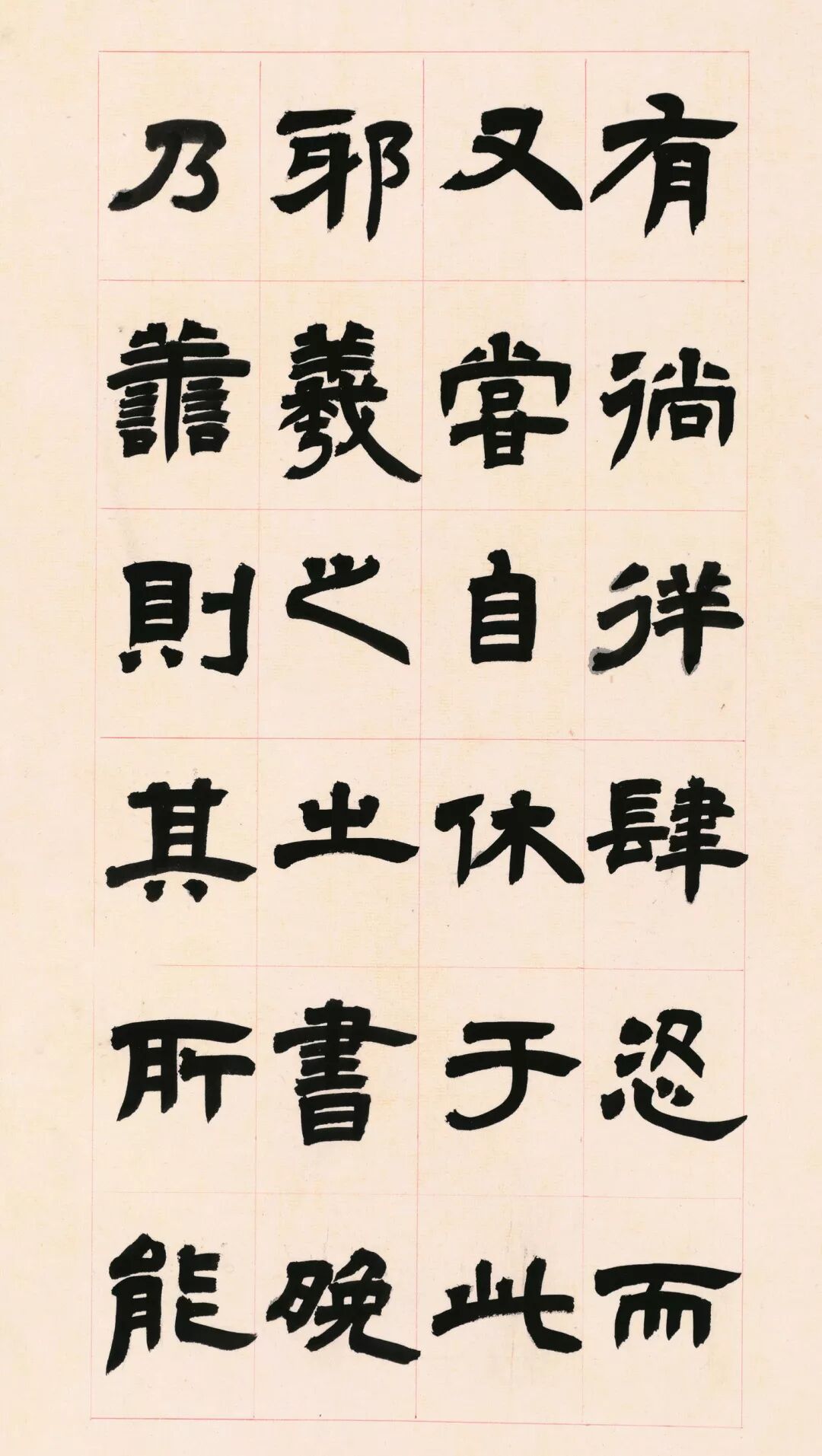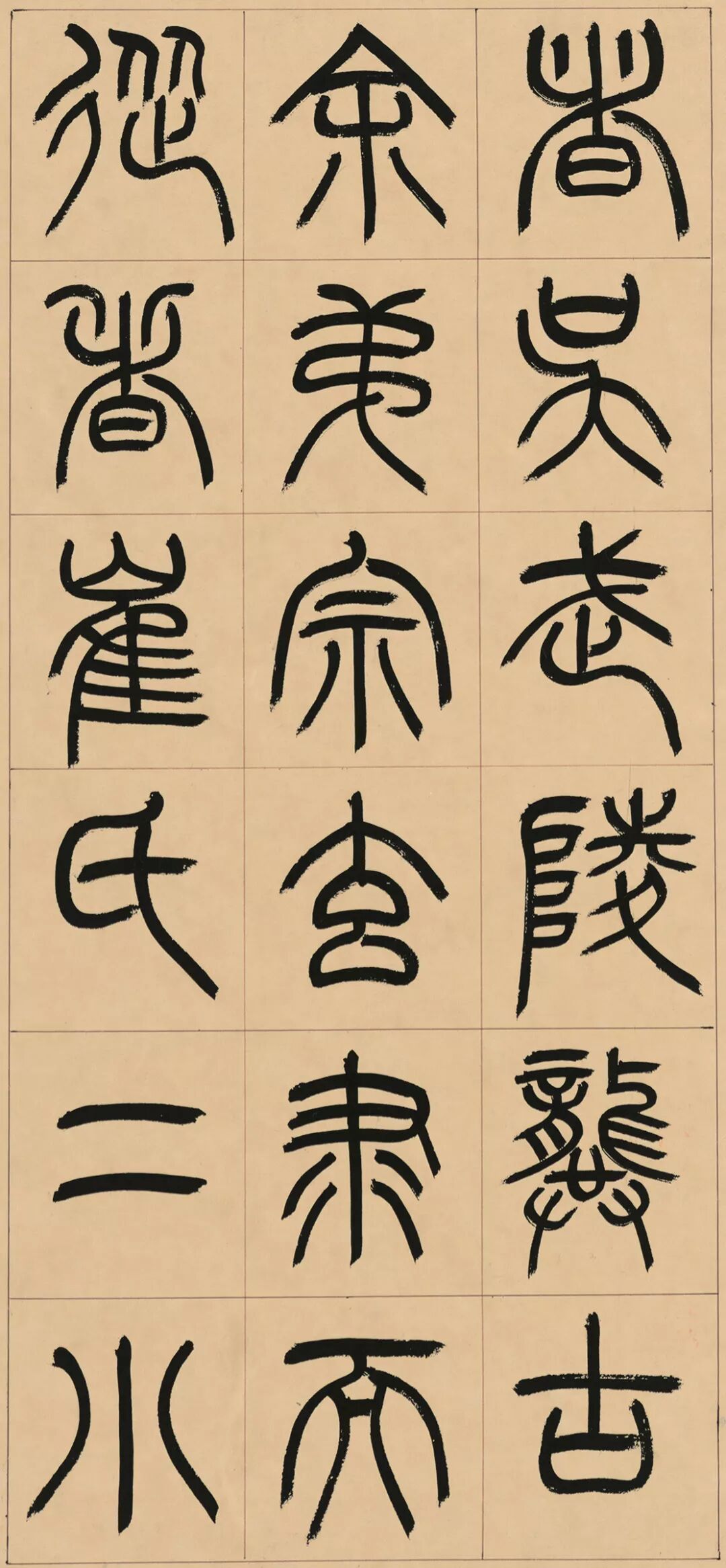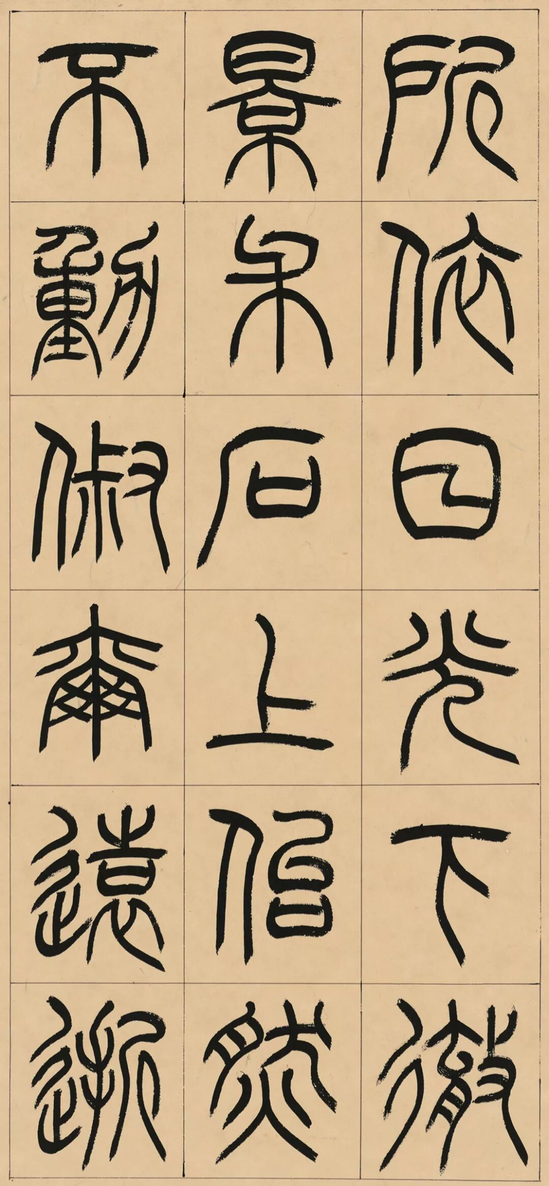 因册页本案头展玩之物,故以篆、隶创作之,必以笔法圆融、结体修美、布局精整、风格雅正为主流表现之手段,以求其雍容混穆、朴茂典雅之气息。又凡篆、隶皆取古汉字之构成,故每字书写必有丰富生命力之表现,取自然之法,百物之状,情趣盎然,正大气象。