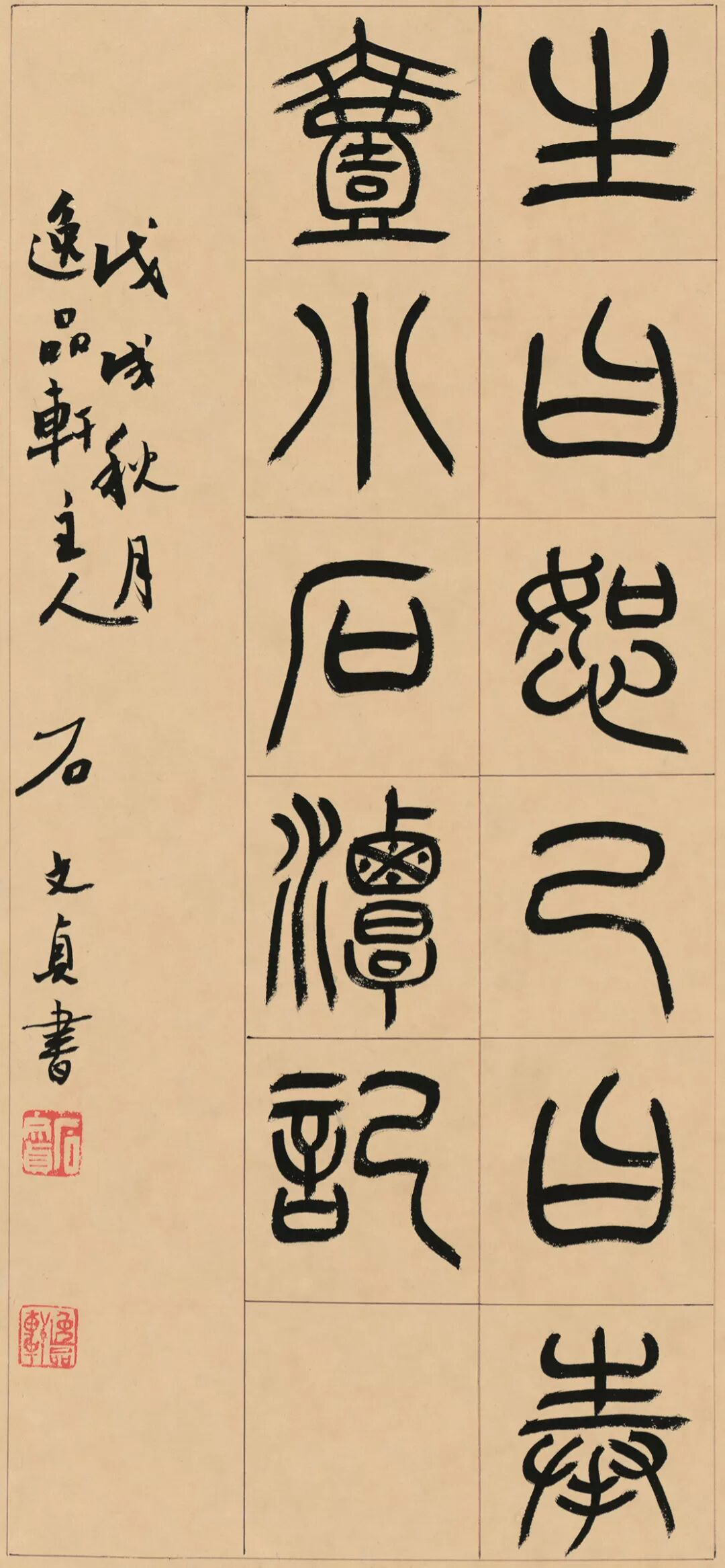在当代年轻书家中,石文贞是一位长期执着于篆书学习和研究的优秀作者。书如其人,温文尔雅。正如第五届中国书法兰亭奖颁奖词中所称许的“笔法圆熟、结体修美、布局精整、意态安详、笔墨悠游”。更加难能可贵之处,乃是在其日渐成熟的创作中,能不安现状,不为成法所囿,开拓进取,不断修正和完善自我。