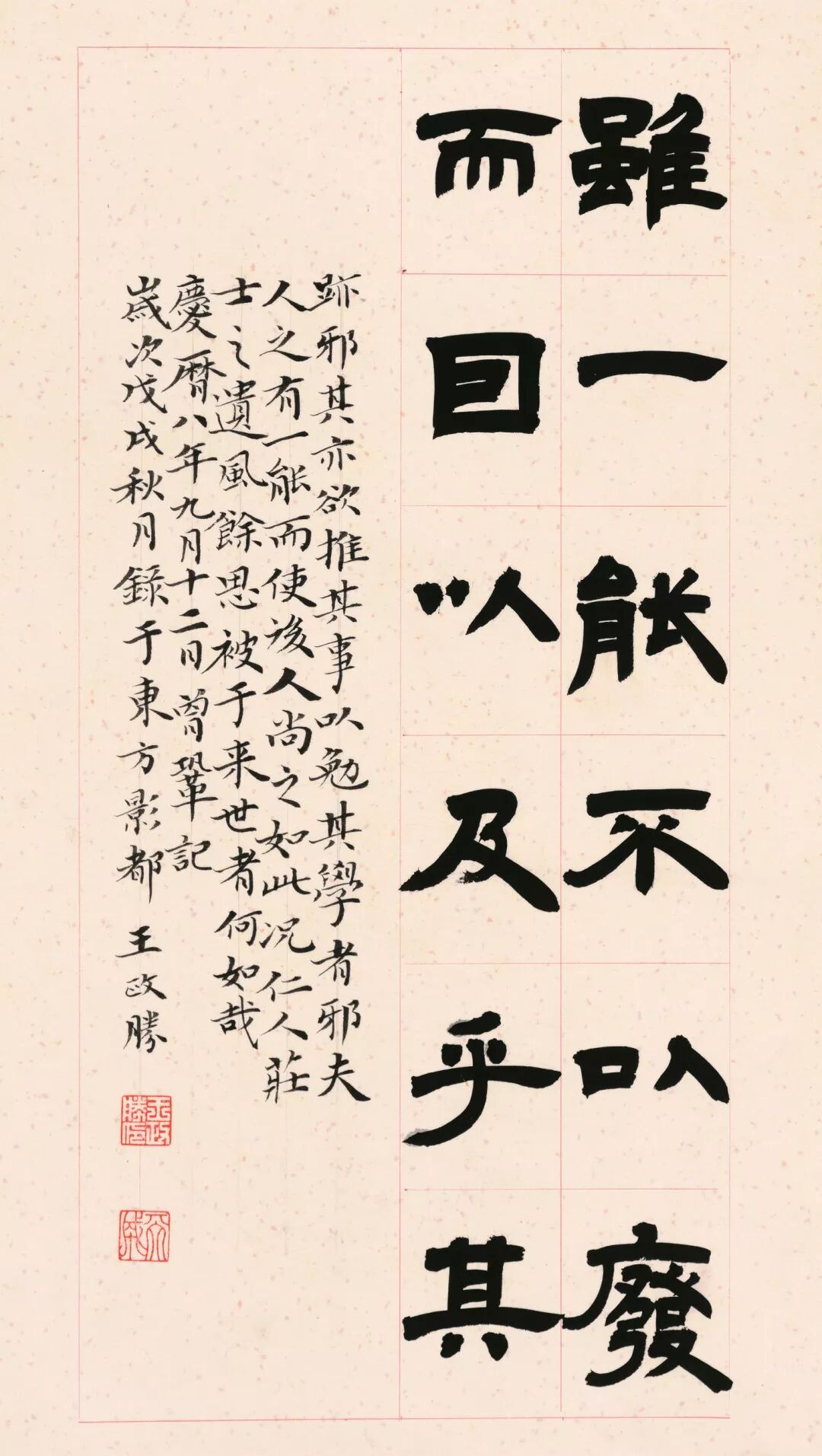 元·吾丘衍《论篆书》云:“篆法匾者最好,谓之‘螺匾’,《石鼓文》是也。凡小篆,喜瘦长,螺匾法非老手莫能到。”这件作品则在其原来师承清人吴让之、邓石如等诸家的基础上汲取《石鼓文》和汉篆体态的雍容大度,线条在原来的劲健清秀中又增添了浑穆沉厚,结体则变修长秀逸为宽博质朴,从当初师法前贤的亦步亦趋、如影随形,跨越到现在的心领神会、融会贯通。在平和、雅致、从容、淡定的书写状态中,手笔自达,不待心思,首尾如一,贯彻始终,心手相应出一派清新晓畅而又沉静古雅的景象。若抛开贵远贱近、厚古薄今的心理,暂且不论今人与古人在传统文化即学问修养和道德文章上普遍存在的差距,单从这幅作品的书法艺术角度而言,即使放进清代和民国的篆书汇集中,也丝毫不比除去那几位巨匠大家经典之外的一些优秀作品逊色。完全可以说,在未来的漫长艺术道路上,作者如能永久保持这种书写状态下的艺术创造力和表现力,“技道双修”,勇猛精进,日后大成,定非妄语!