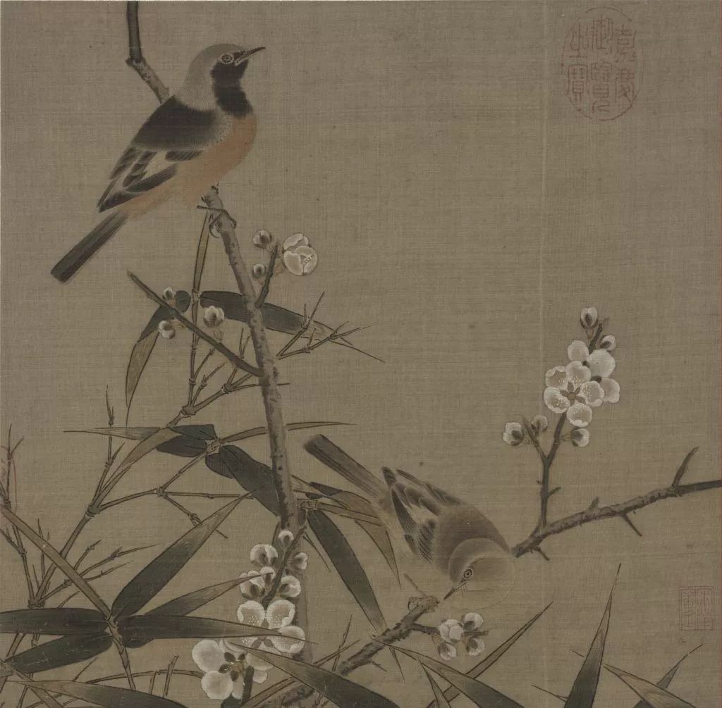 宋 佚名 《梅竹双鹊图》页,绢本,设色,纵26cm,横26.5cm