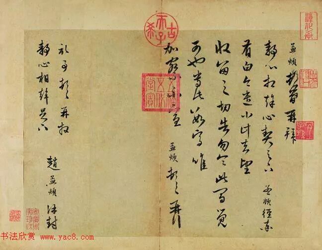 该帖是赵氏写给吴森(字君茂,号静心,吴兴人,好古画)的信札,应书于赵氏在江浙任职时。该帖法度谨严,飘逸潇洒,笔法圆润流畅,起笔藏露结合,运笔迟速交错,转折方圆交替,收笔顿锐相间,提按轻重多变,展现了赵孟頫高超娴熟的书法技巧。