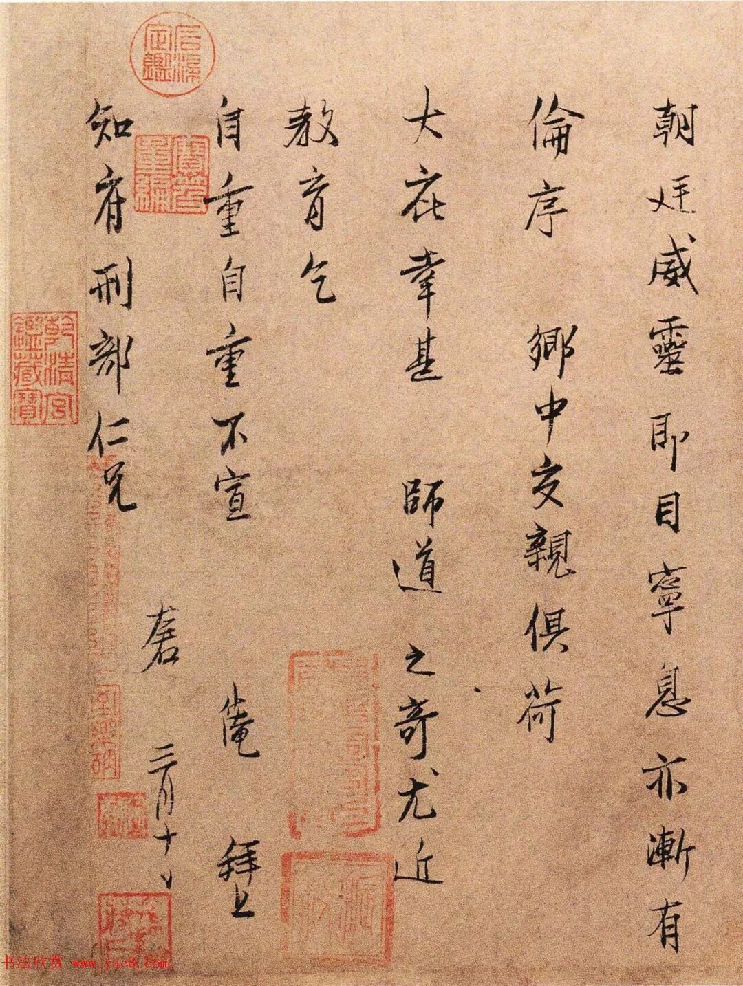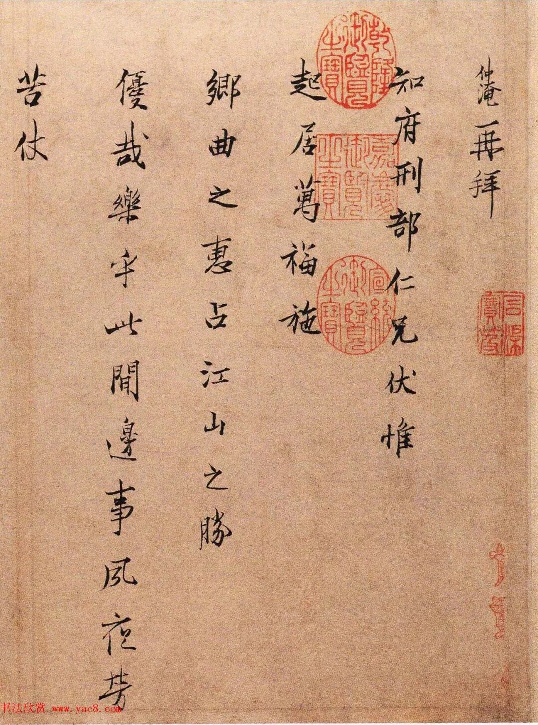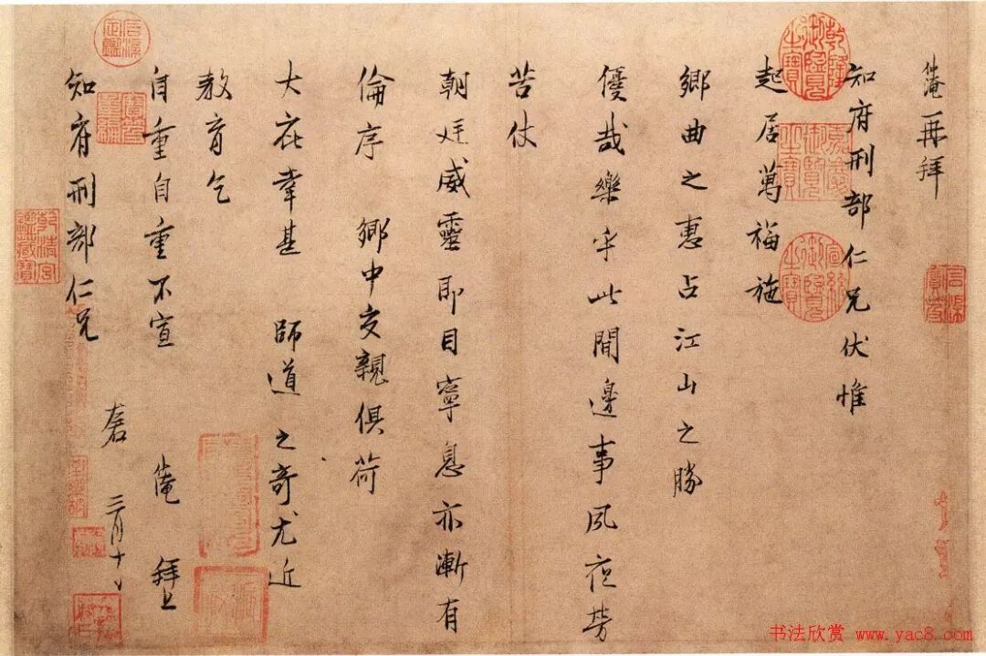 “仲淹再拜,知府刑部仁兄:伏为起居万福。施乡曲之惠,占江山之胜,优哉乐乎。此间边事,夙夜劳苦。仗朝廷威灵,即目宁息,亦渐有伦序。乡中交亲俱荷大庇,幸甚。师道之奇,尤近教育,乞自重,自重。不宣。仲淹拜上,知府刑部仁兄左右。三月十日。”