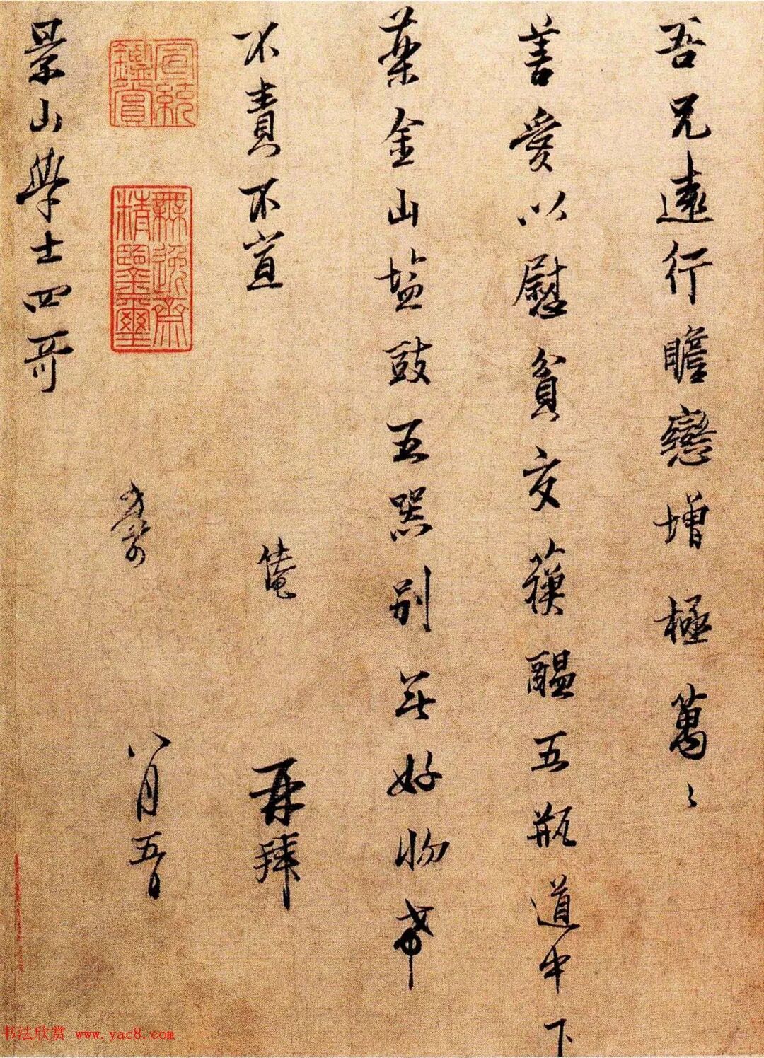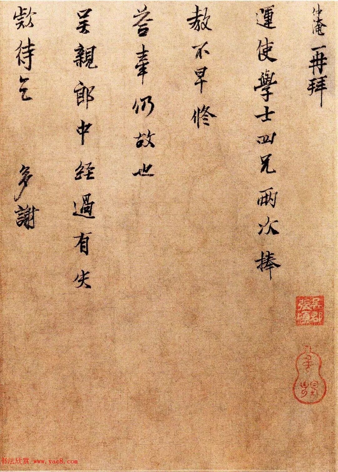 “仲淹再拜,运使学士四兄:两次捧教,不早修答,牵仍故也。吴亲郎中经?"有失款待,乞多谢。吾兄远行,瞻恋增极,万万善爱,以慰贫交。苏酝五瓶,道中下药。金山盐豉五器,别无好物,希不责。不宣。仲淹再拜,象山学士四哥座前。八月五日。”