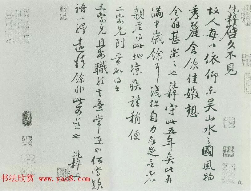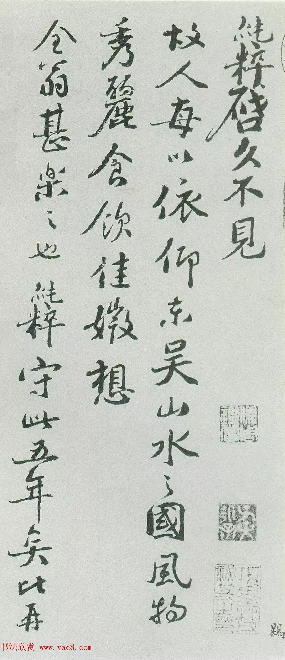 释文:纯粹启 久不见故人 每以依仰 东吴山水之国 风物秀丽 贪饮佳媺 想全翁甚乐之也 纯粹守此五年矣 比再满才岁余耳 浅掘自力 无足言者 亲老得此地凉 疾体稍便 二家兄到晋 数得书 三家兄且安职 然去意常在也 何当款语 以纾远情 余非此可道也 纯粹上