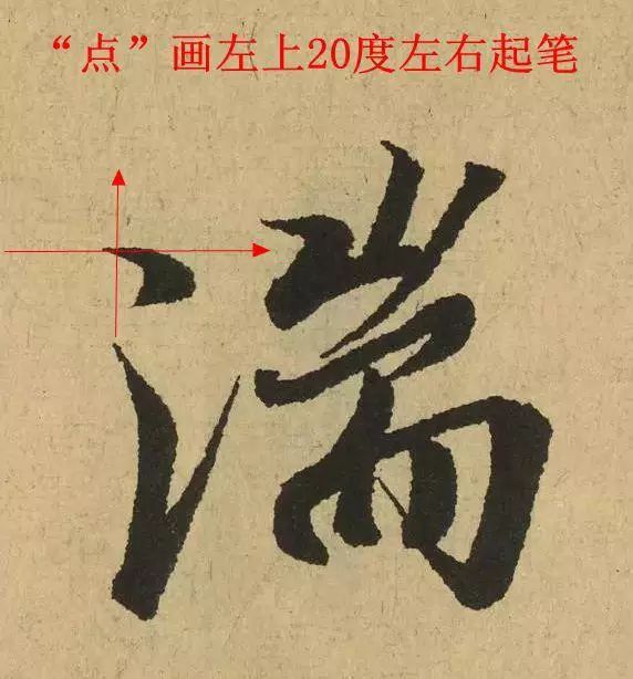 起笔的角度,单独起笔时,与书家的习惯有关,连续书写时,上一笔行笔走向有关。所以,分析、掌握一个具体点画起笔的角度,一定要把这个点画,放在一个连续书写动作过程中进行考虑和定位。如此,才能准确掌握笔锋空中的走向,以及入纸的角度。