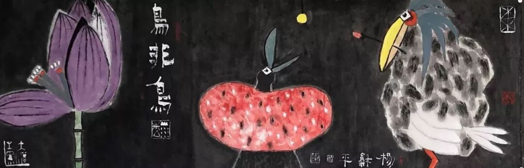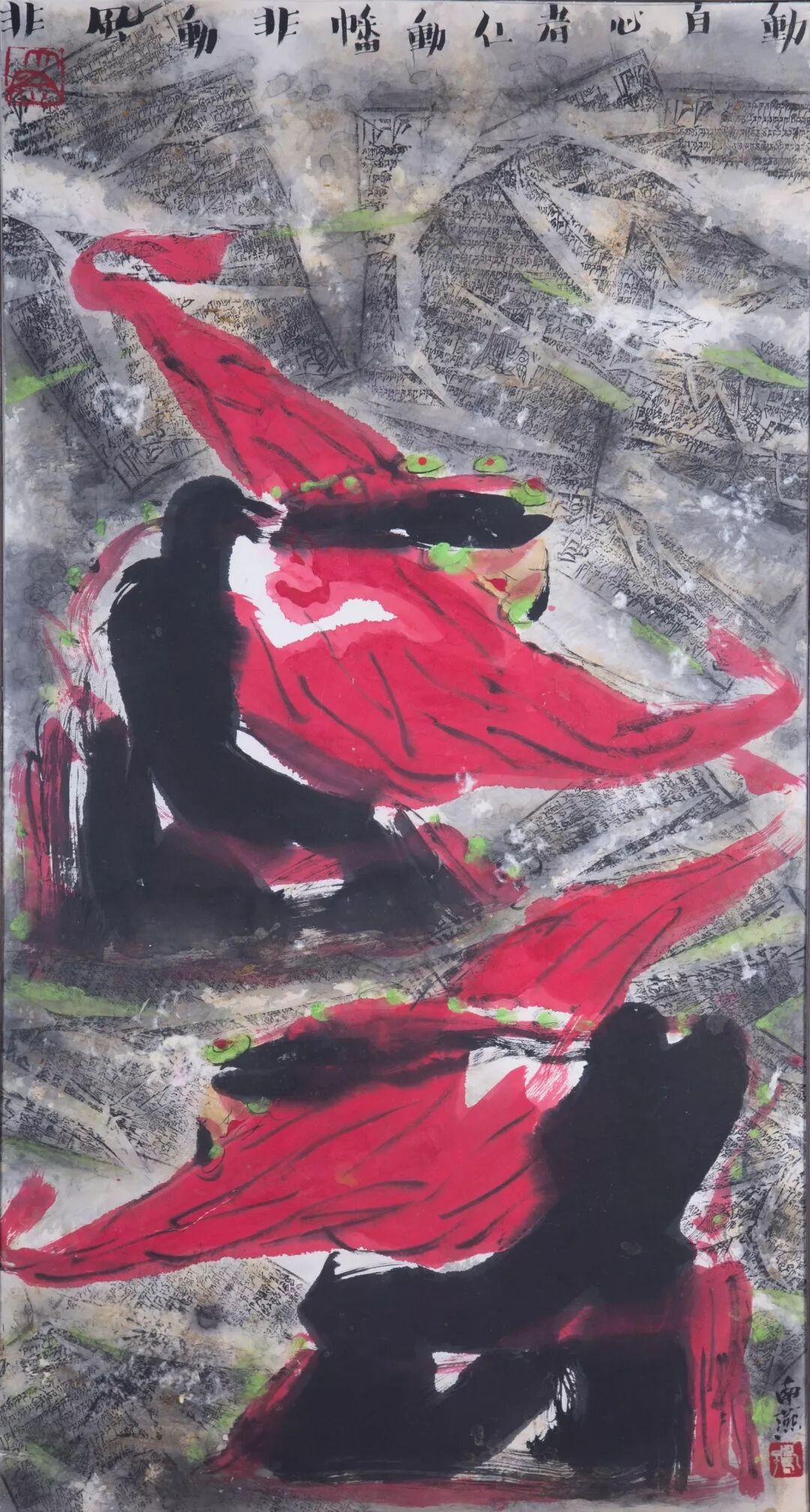 在这种“味道”的追求中,杨先生也在愈来愈多的注入了个人的情怀表达。比如在近年创作的水墨画中出现了很多鸟的形象,更像是他安插在作品中的代言人。代其言叙着画家个体在生活日常的感知与思绪。这只拙朴的大嘴鸟,时而自得其乐,静看水中倒影,时而拈花自喜,时而水中观鱼,时而穿梭于古佛崖壁之间,时而又被溶置于汉唐时光的造境里自我冥想……这种游离于心胸内外、古今之间,何尝又不是杨先生个人情怀在社会生活感知后的人文体现呢?