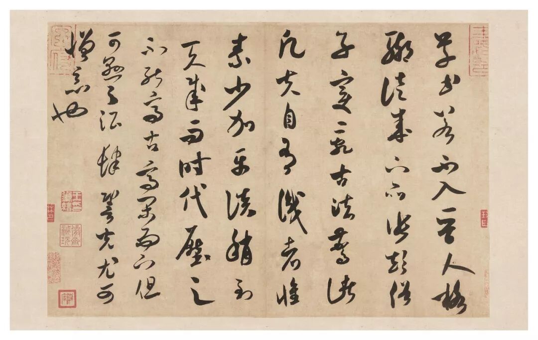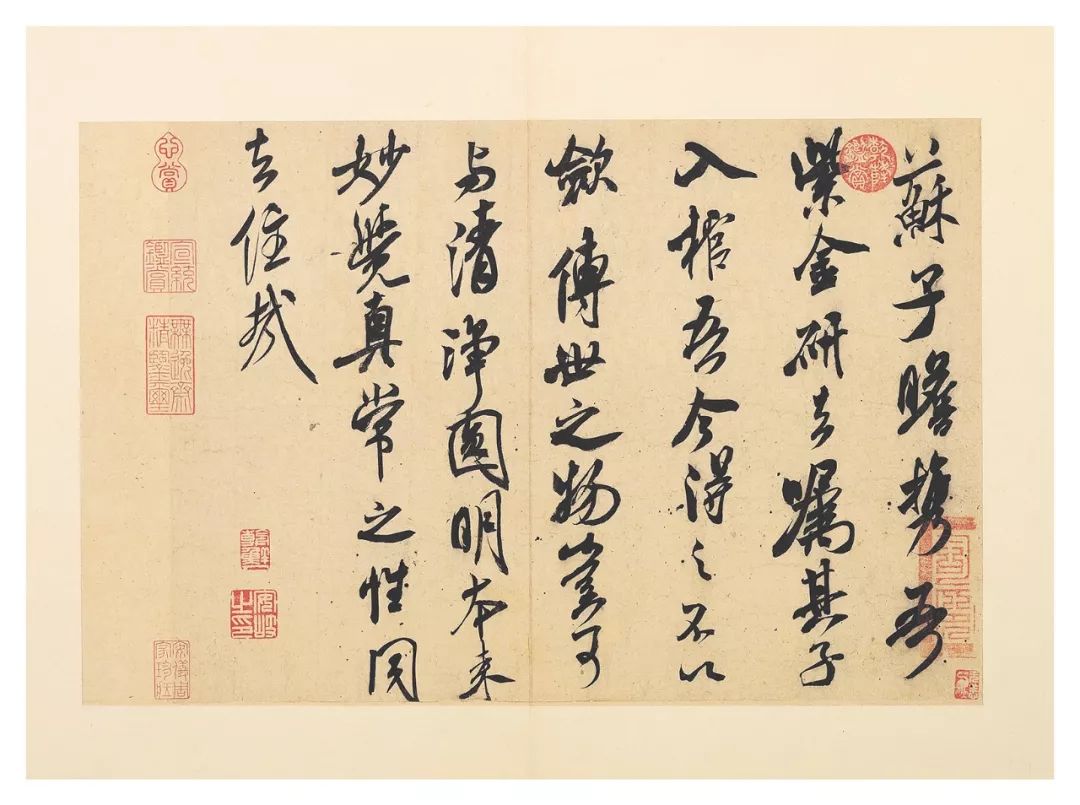 而米芾之书在于后天苦练,当然并非否认米芾的天资,而是说相较于苏轼书法的自然而为,米芾更多表现出后天的博古,篆、隶、楷、草穷极古人之幻变,又融自家于一炉,因此有人打趣说米芾之字是刷出来的,可以精致到与古人通神之地步,以假乱真。其书指追魏晋,但又有着宋人特有的意趣。正如姜白石所言“无垂不缩,无往不收!”