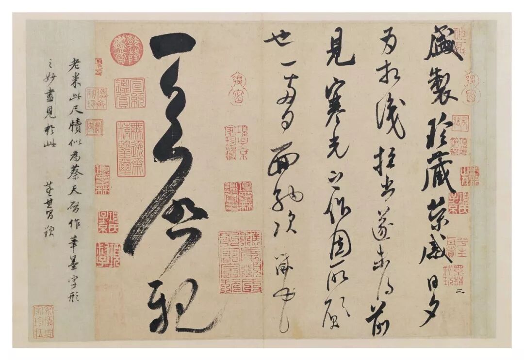 米芾性情癫狂而嗔迷,整体布局大气,稳不俗、险不怪、老不枯、润不肥,仿佛醉酒疯癫之人仍保持清醒的意识,此态张狂,此态跌宕风姿、骏快飞扬,是为书而痴也。