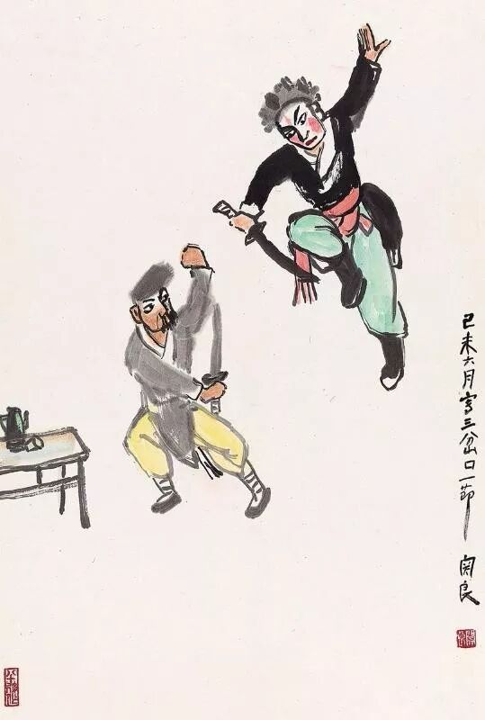 关良的画可以这么说,他深得中国画天真淡然、简洁明快、天韵流溢之要,开创立了中国戏曲人物画的流派,开辟了一代画风。
