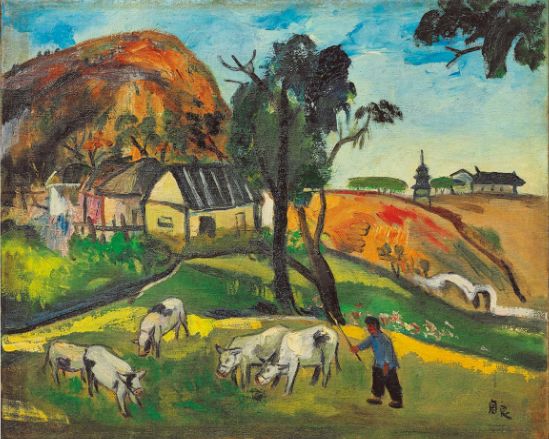 关良《牧牛》,油彩、画布,55x67cm,1965
