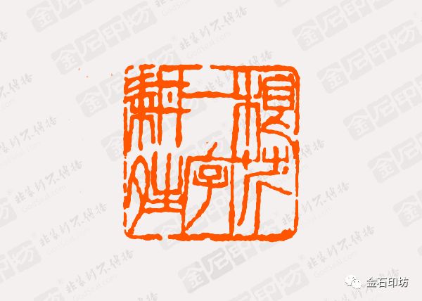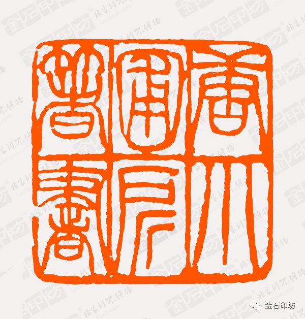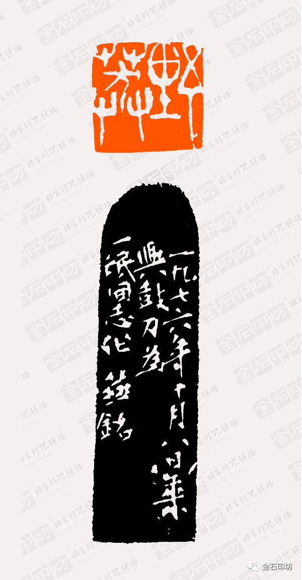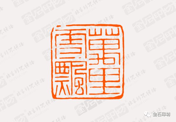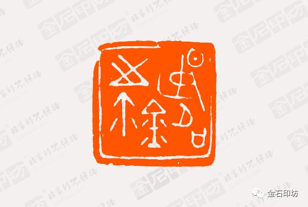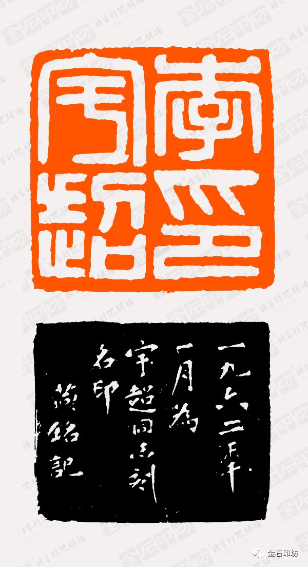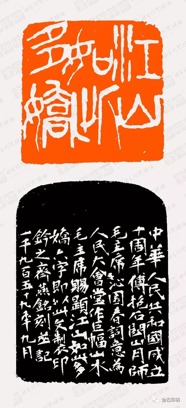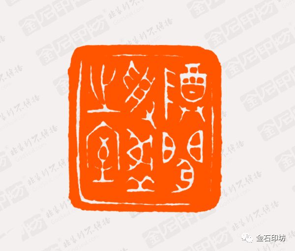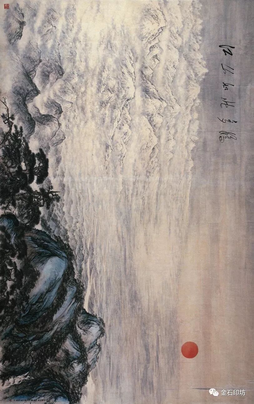 如果你认为金石君是来介绍这幅画的,那你就错了,金石君今天带来的还是印章。看完这幅画,不知道大家有没有注意到钤在左下角的那一方压角章呢?虽然这方印在这幅画上面显得很小,但是实际上它的尺寸并不小,它是一方印面足足11cm的大方章,它在画中的位置正好与太阳在一个对角线上,用来作呼应,起到了稳定整个画面的作用。