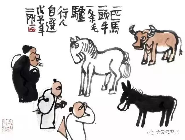 齐白石的画也有漫画成分,这跟画家的天性、天趣有关。漫画的目的主要是加强意趣,突出主题,让人感悟更深。漫画加上笔墨,这无疑也给国画添一条新路。