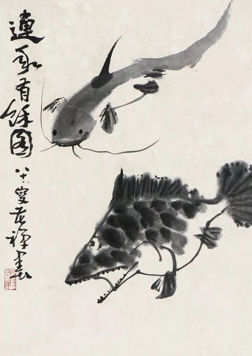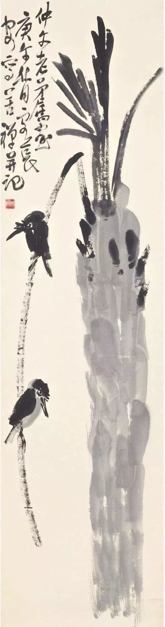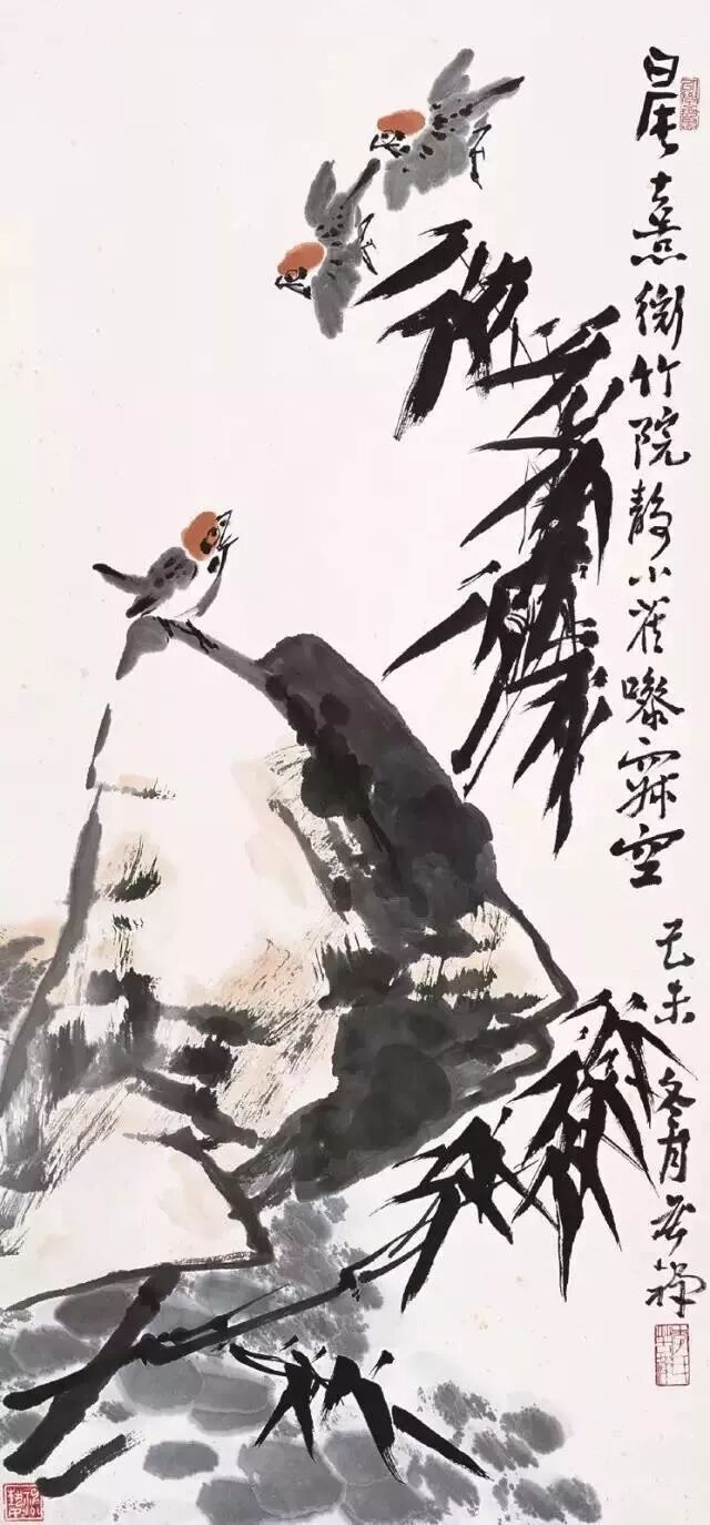 世人写“王字”多俗,唯八大山人写“王字”不俗。赵之谦用魏碑笔法作写意。吴昌硕用《石鼓文》笔意入画。齐老先生也如此,不过他练的是《汉三公山碑》、《吴天发神谶碑》和李北海的行书。不练书法就别想画好写意,这书法一门,是活到老,练到老;写意,它笔笔全都是写出来的!若没书法底子,只是画出来,描出来,修理出来,便没魄力,不超脱,显得俗气。