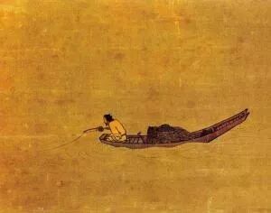 画面解析:这幅画作者运用铁线描,描绘了漂浮于水面的一叶扁舟和一位老翁坐在船头俯身垂钓的场景。整个画面,除了船旁以淡墨寥寥数笔勾出水纹,四周都是空白。但正是这种“虚实相生”的空白感更突显出“独”的奥秘,增强了烟波浩渺的江水和极强的空间感。再者,艺术表现上,取平远布局,构图有宋人笔意,是中国艺术的一个重要特点。