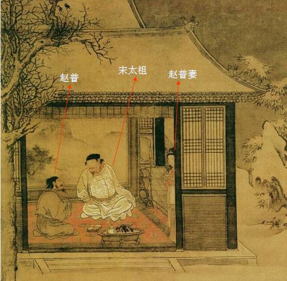 于是,赵普铺设红色双层垫褥请宋太祖坐在堂中在炽红的炭火上烧肉吃。赵普的妻子敬酒,宋太祖称她为嫂子。