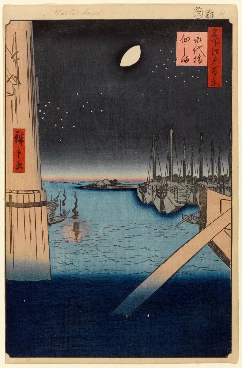广重的作品几乎都是采用竖幅构图,他采用日本传统绘画中的俯瞰式手法来调度空间位置,将地平线抬高,或有意压低地平线,大面积空白与景物产生对比,使构图更富趣味。