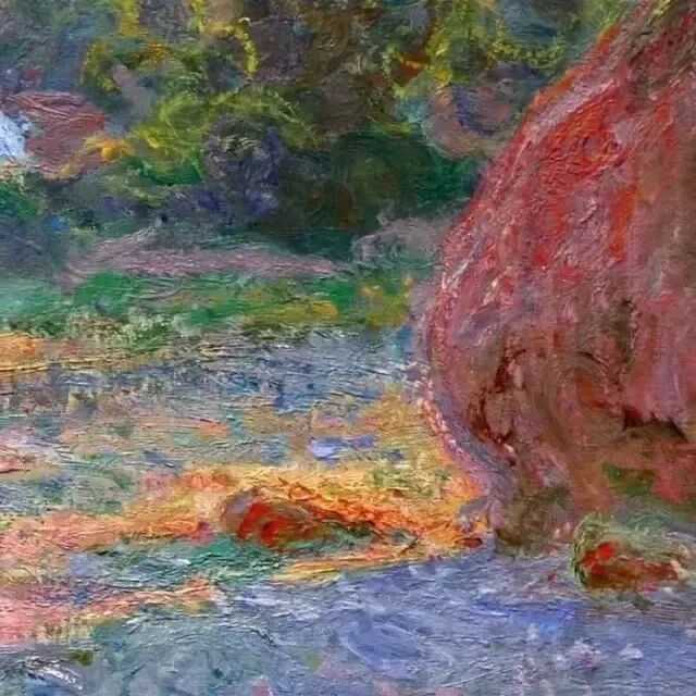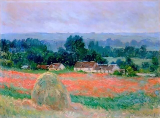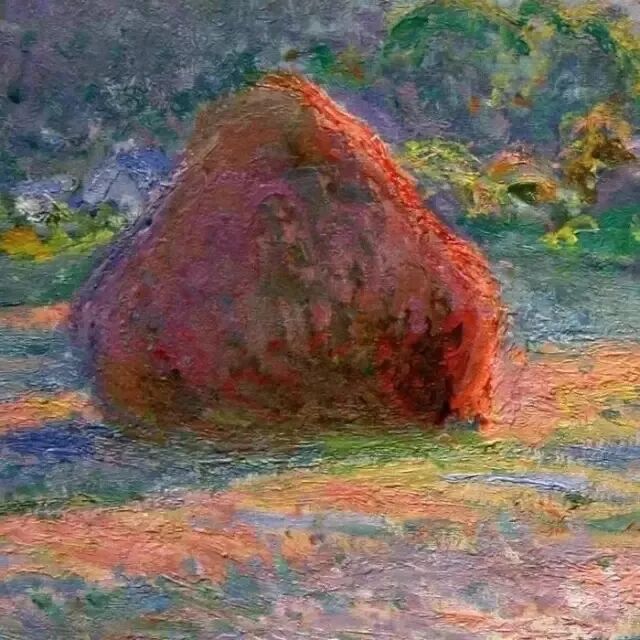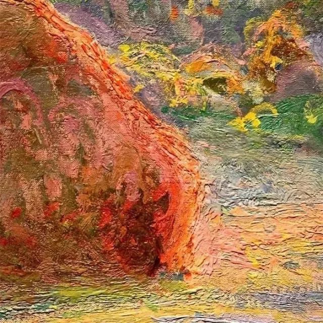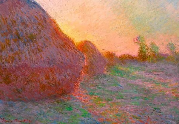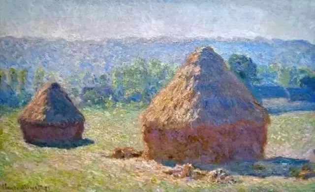 在1912年7月7日另一封写给古斯塔夫·吉弗罗瓦的信中:“我只知道画,以此表达自己在大自然面前的感情,并且常常为了正确地表达自己的感觉,我完全忘掉了最起码的绘画法则,如果这些法则依然存在的话……这是经常发生的,也使我自己苦恼不已。”莫奈的创作理念是忘掉所描绘的物体,所关注的只是颜色,蓝色、粉红……如此,我们平常所看到的固有色是土黄、暗部是黑色的草堆,在莫奈的笔下变的富有生命活力。