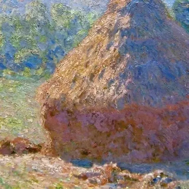 莫奈的这一组《干草堆》就是为了证明:同一样东西在不同光线下的不同效果。还可以看出印象派画家的另一个曾经倍受众人嘲笑的信念——影子也是有颜色的。莫奈在给一位作家朋友Gustave Geffroy的信中说,“我承认要想寻求和捕捉由于光的瞬时和不断变化作用所包裹的外形似乎是不可能的。”但事实上,莫奈做到了。