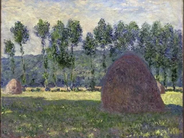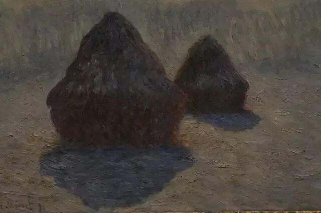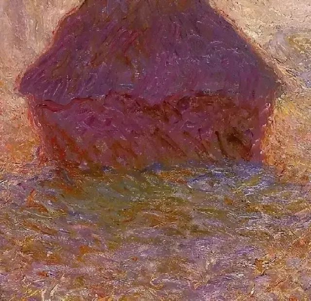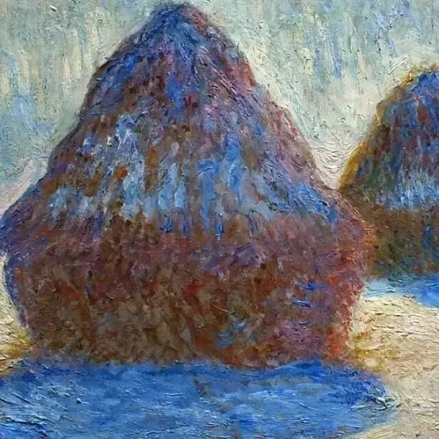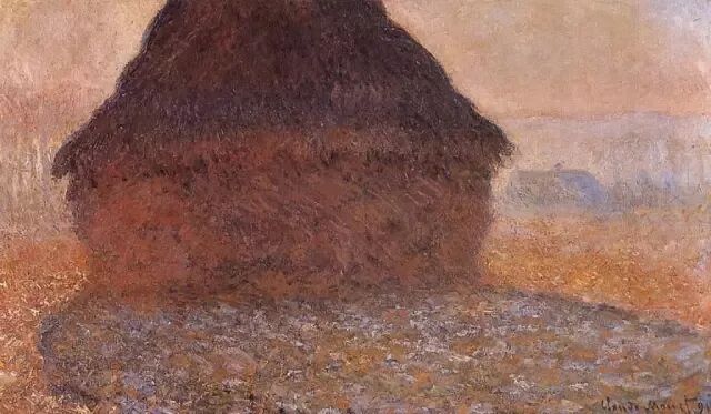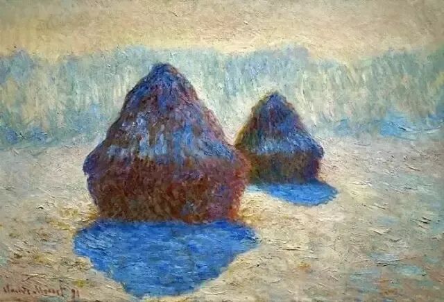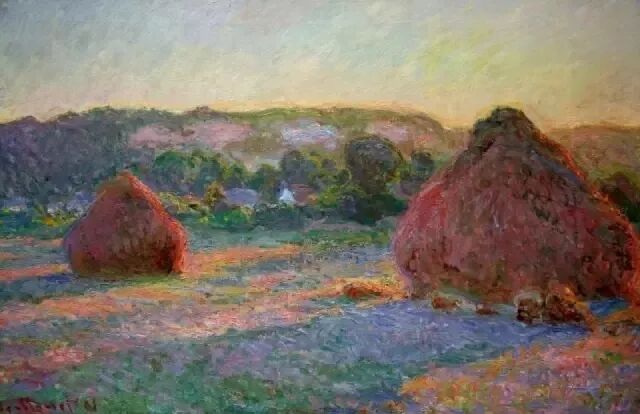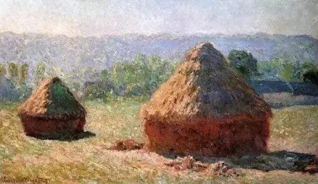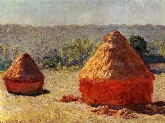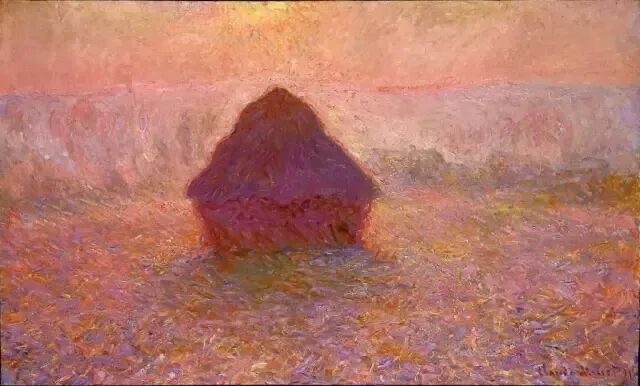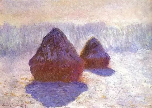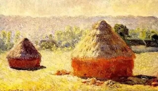莫奈花了两年多的时间,每天不分晨昏早晚,都在画这个干草堆,出门时带十几块画布,随光线或天气的改变而一块块地换着画。这些干草堆,有中午烈日下的干草堆,有雪后初霁的干草堆,有清晨薄雾中的干草堆,有黄昏薄暮时的干草堆。