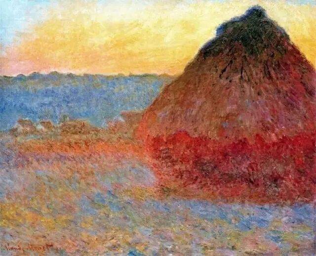 于是,他准备了两块画布,一块用于晴天表示阳光充足时的效果,一块用于阴天表示柔和光线效果。后来发现,不论晴天还是阴天,光线都是随时在变化,太阳快落山了,那绚丽的晚霞在干草堆产生了非常奇妙的色彩效果,莫奈急于把它画下来。