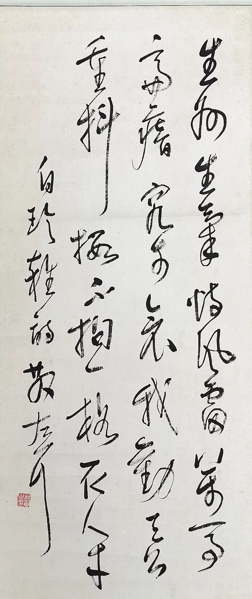 林老的草书墨色变化多端,他的书法有浓墨有枯墨,视觉对比明显,章法严谨。虽然是草书,但是每一幅作品的正文和落款经过细心的布局,并不是随意书写。他的草书气势连贯,有时候一笔下来写七八个字,线条变化不一,留白自然。运笔过程中不经意间的墨色变化,使得作品枯中有润,浓淡相宜。他的草书擅长使用长峰羊毫,在运笔中使用中锋,线条稳健瘦劲,形成自己独特的线条艺术,这种线条有着微妙的变化,并有着林散之特有的艺术感染力。